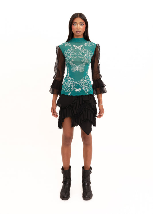 Ornate/ butterfly print frill sleeve mesh top