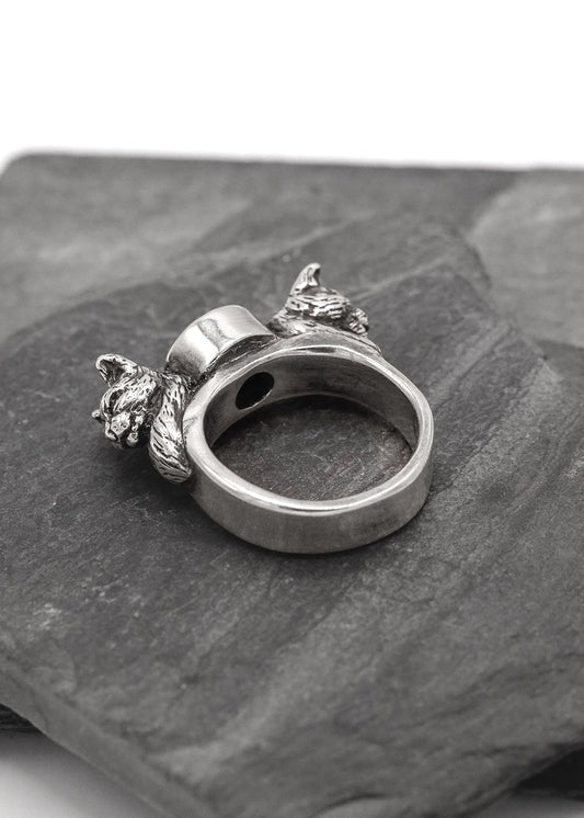 Double cat head ring with garnet