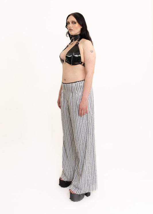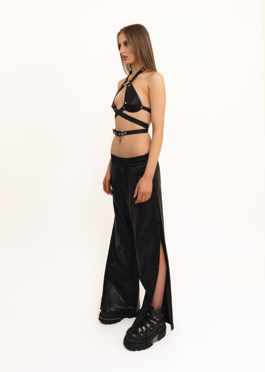 Sheer wide leg silk pants with leather accents