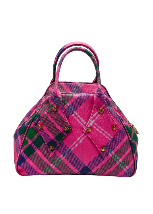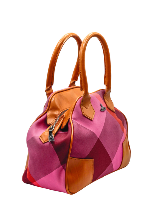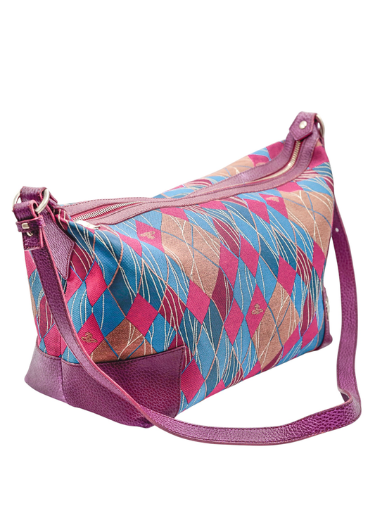Pink/ blue jacquard argyle shoulder bag with leather strap