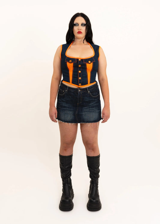 "Remake" style denim/ lace panelled mini skirt
