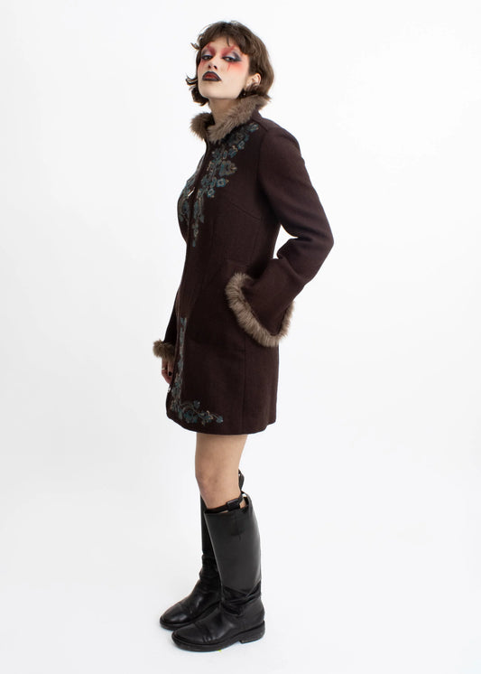 Floral embroidered faux fur trimmed Afghan coat