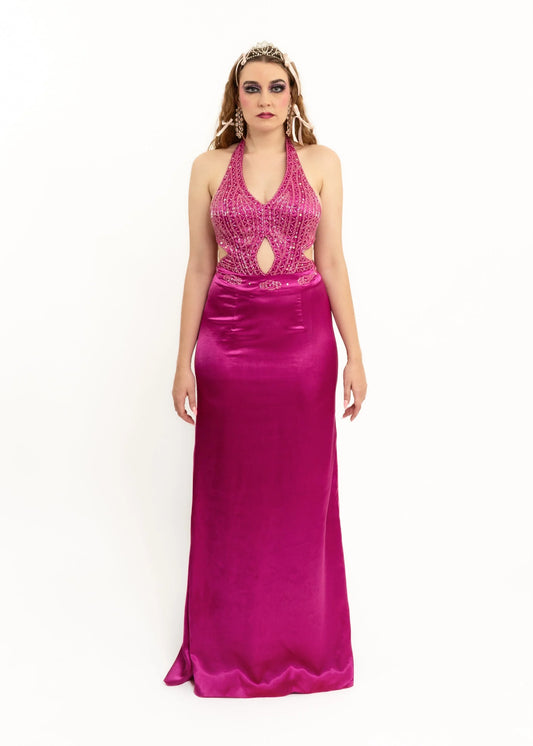 Glass beaded satin cut out gown
