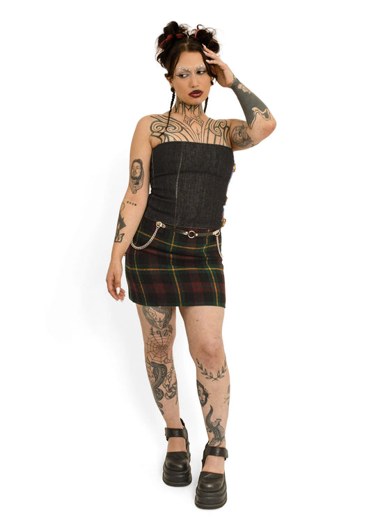 Fall 2018 denim/ tartan bustier with medusa buckle detail