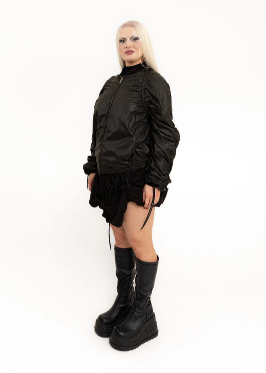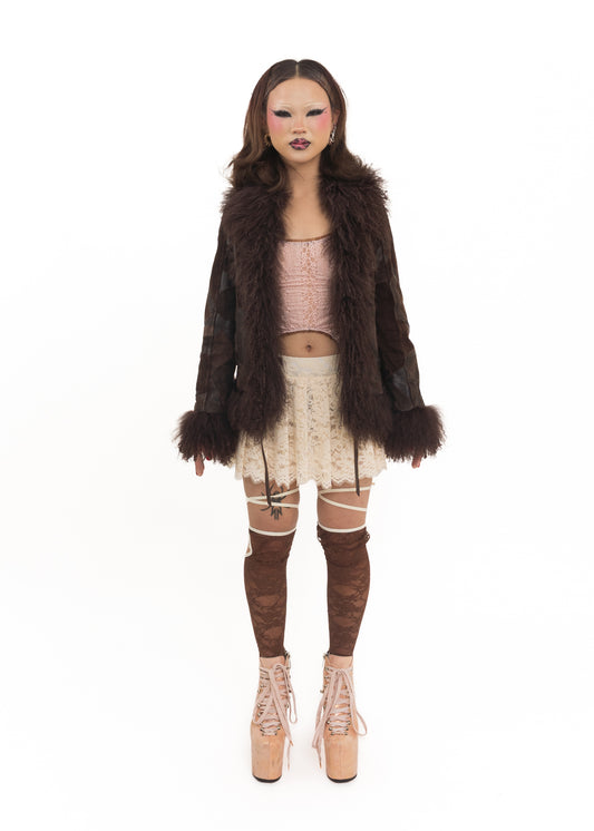 Patchwork leather/ suede jacket with Mongolian sheepskin trim