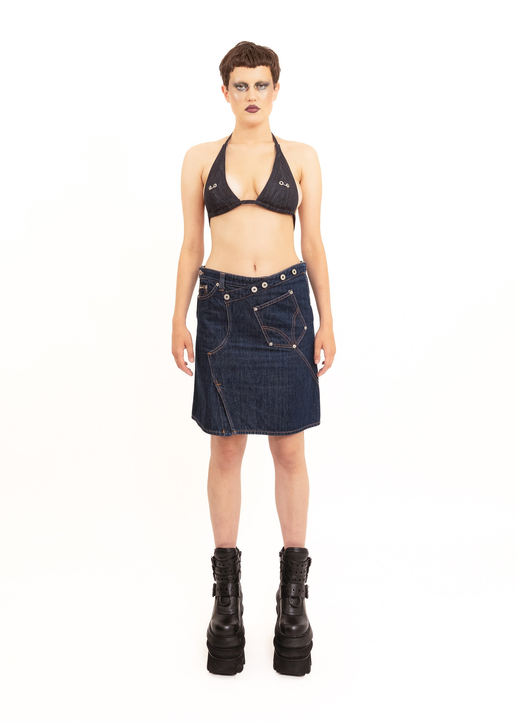 Styled with the pierced denim bikini top