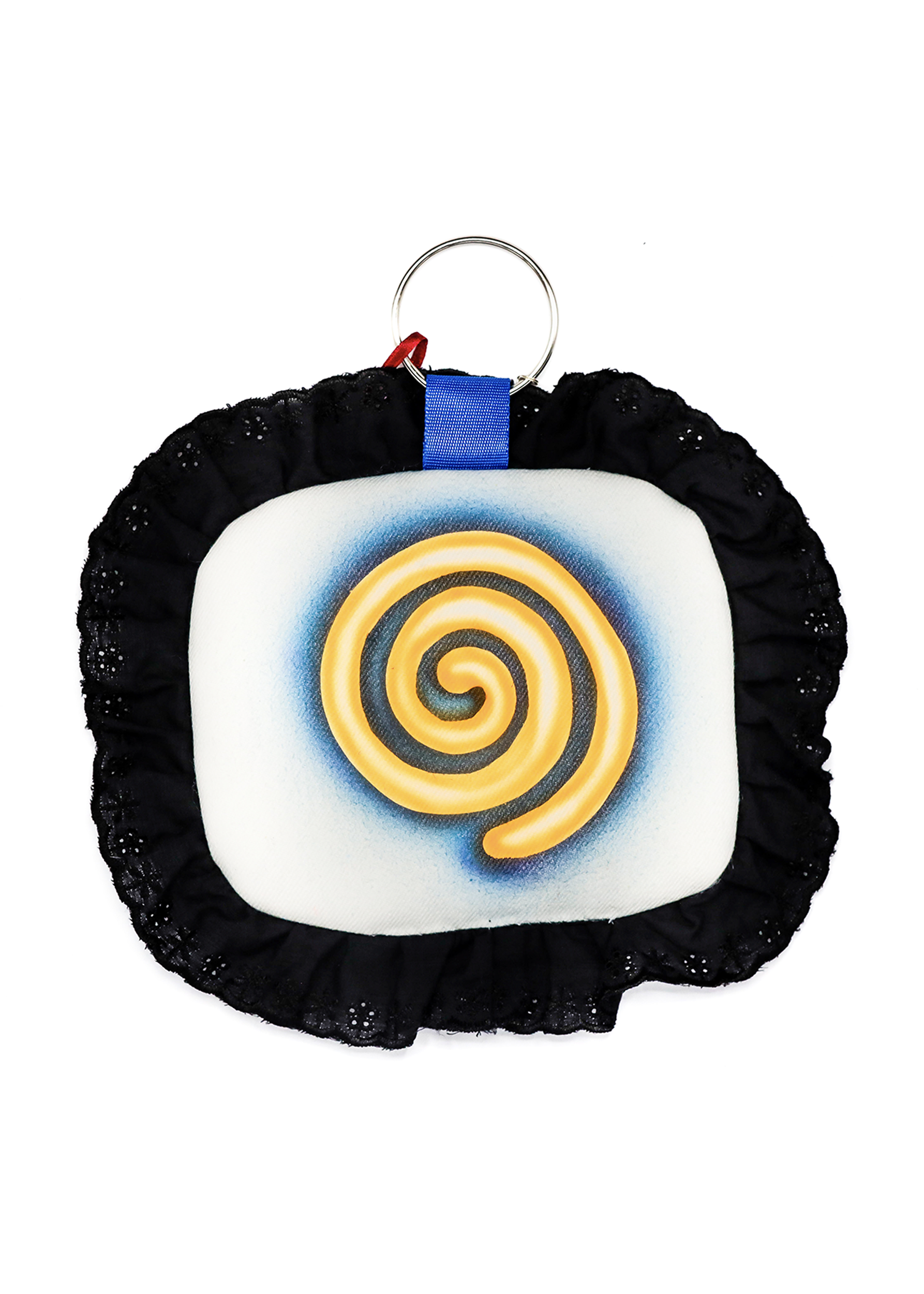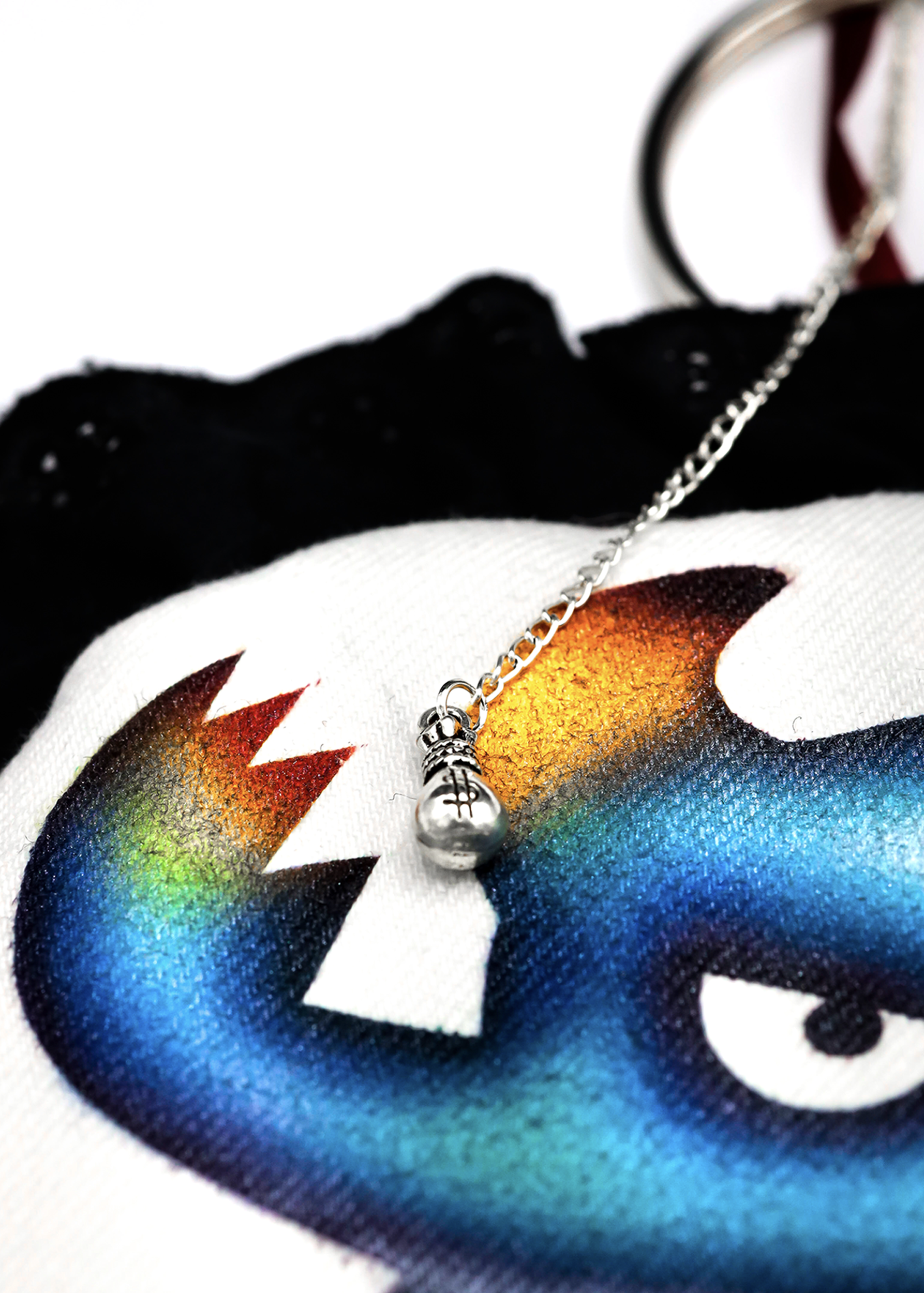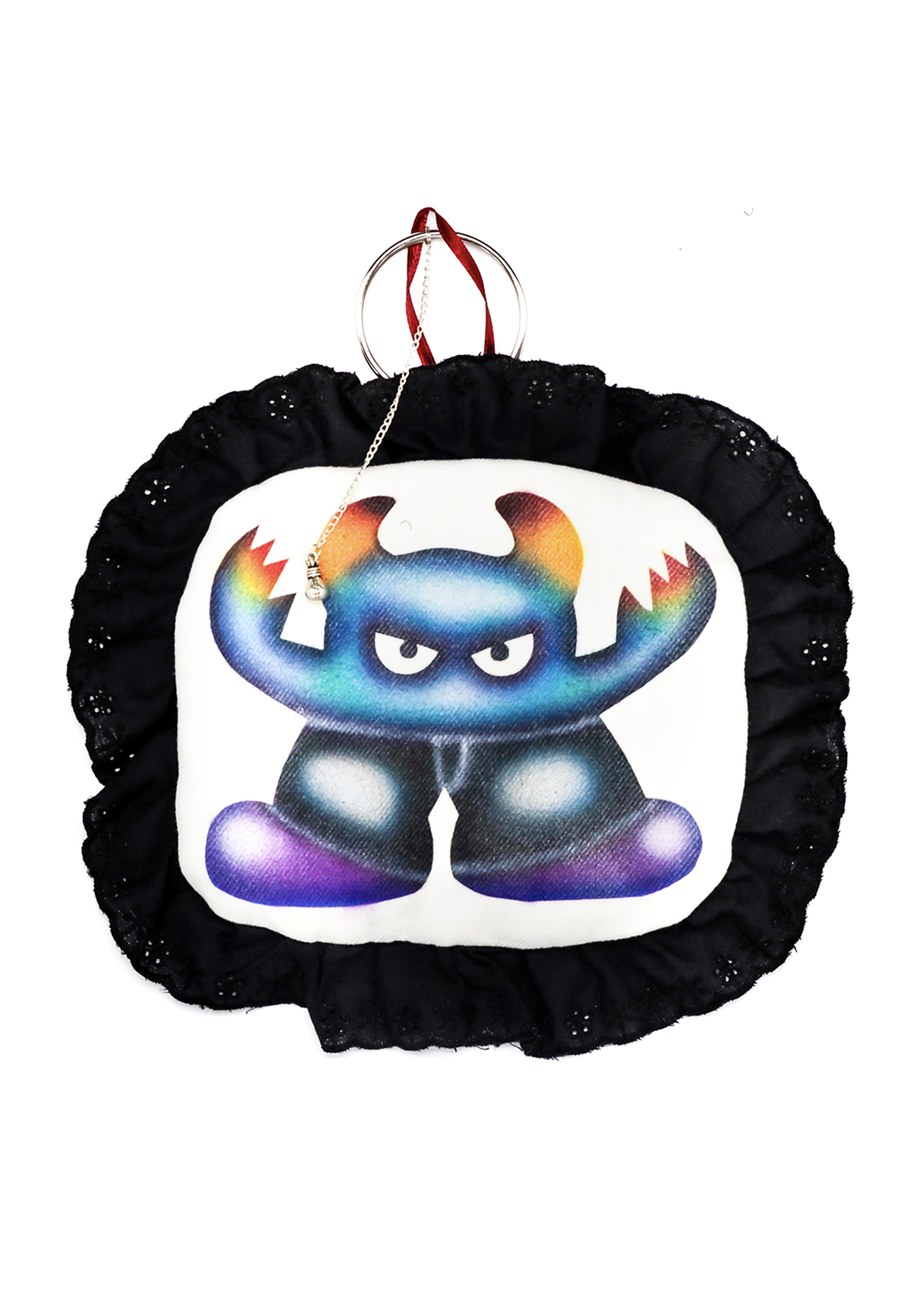 Airbrushed plushie key ring/ bag charm with horned monster character on the front and spiral graphic on the reverse