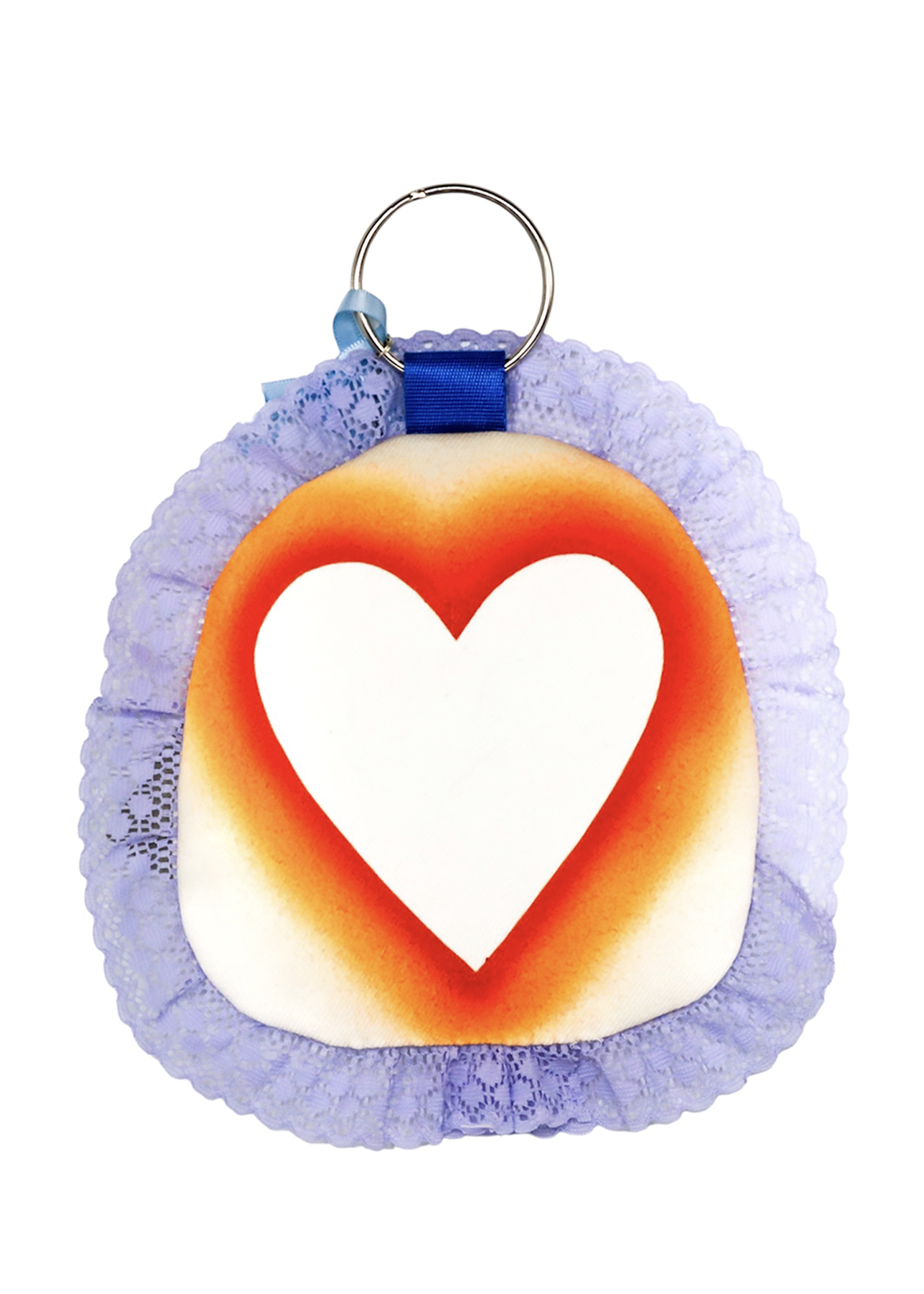 Airbrushed plushie key ring/ bag charm with a cowboy hat-wearing character on the front and heart graphic on the reverse