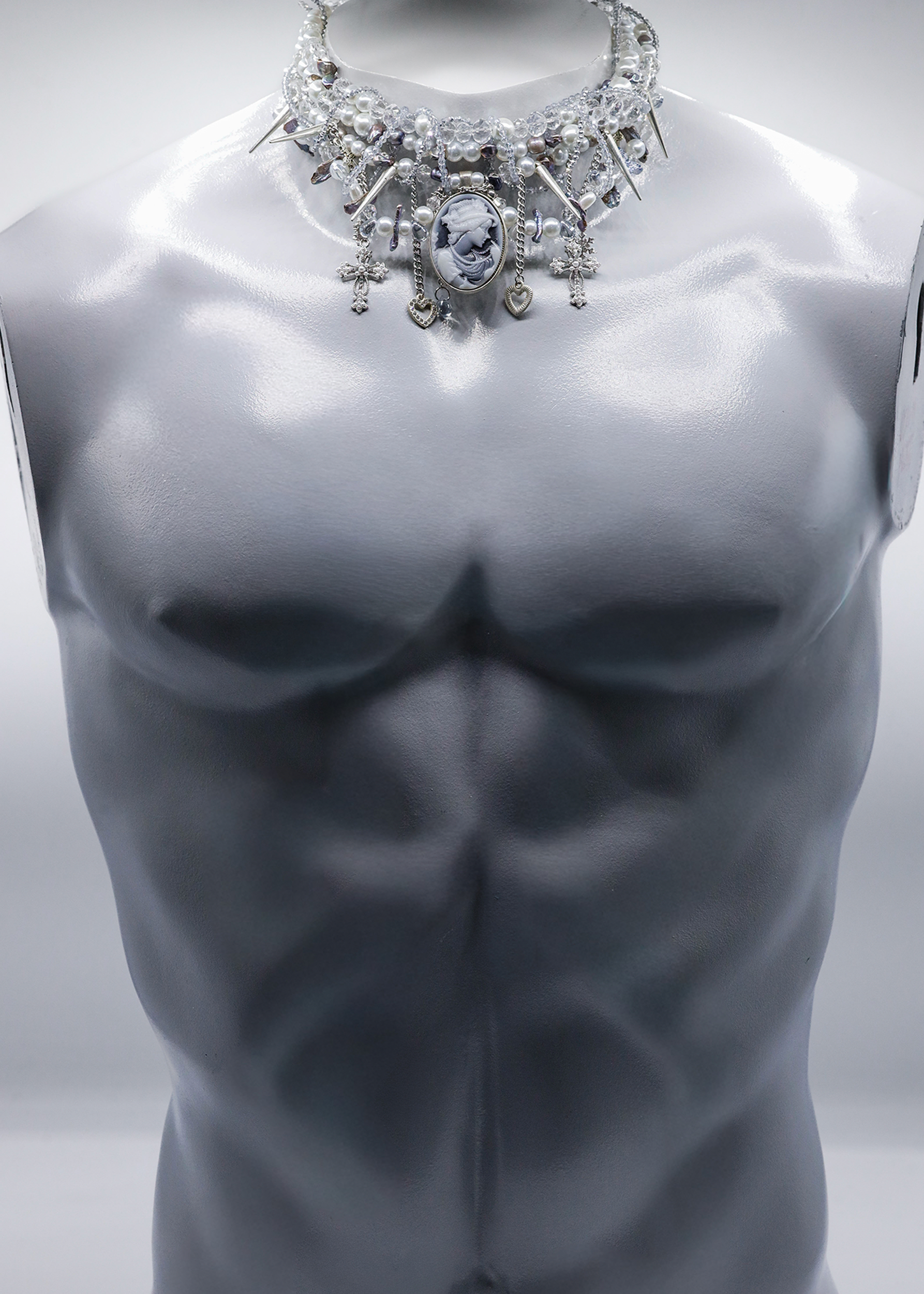 One of a kind handcrafted beaded necklace, featuring numerous interwoven strands, made of a mix of glass and plastic beads, freshwater pearls, spikes and crucifix charms, framing a central cameo charm