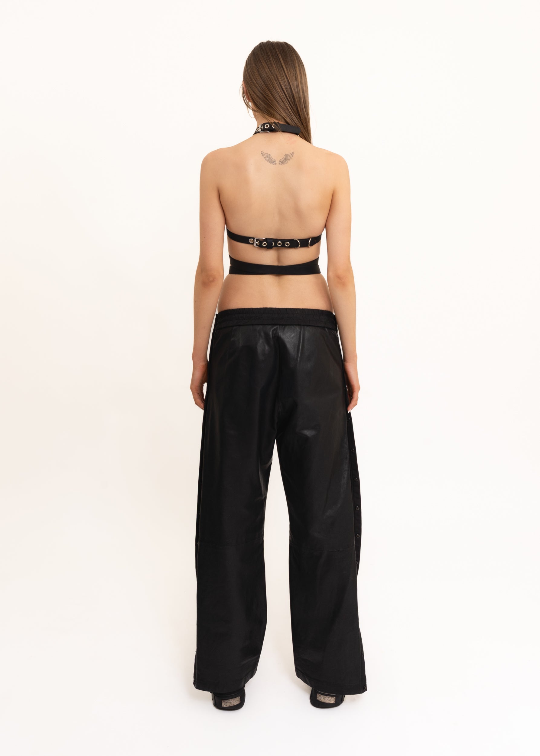 Hand cut, sustainable-consciously sourced leather halter bra with silver hardware