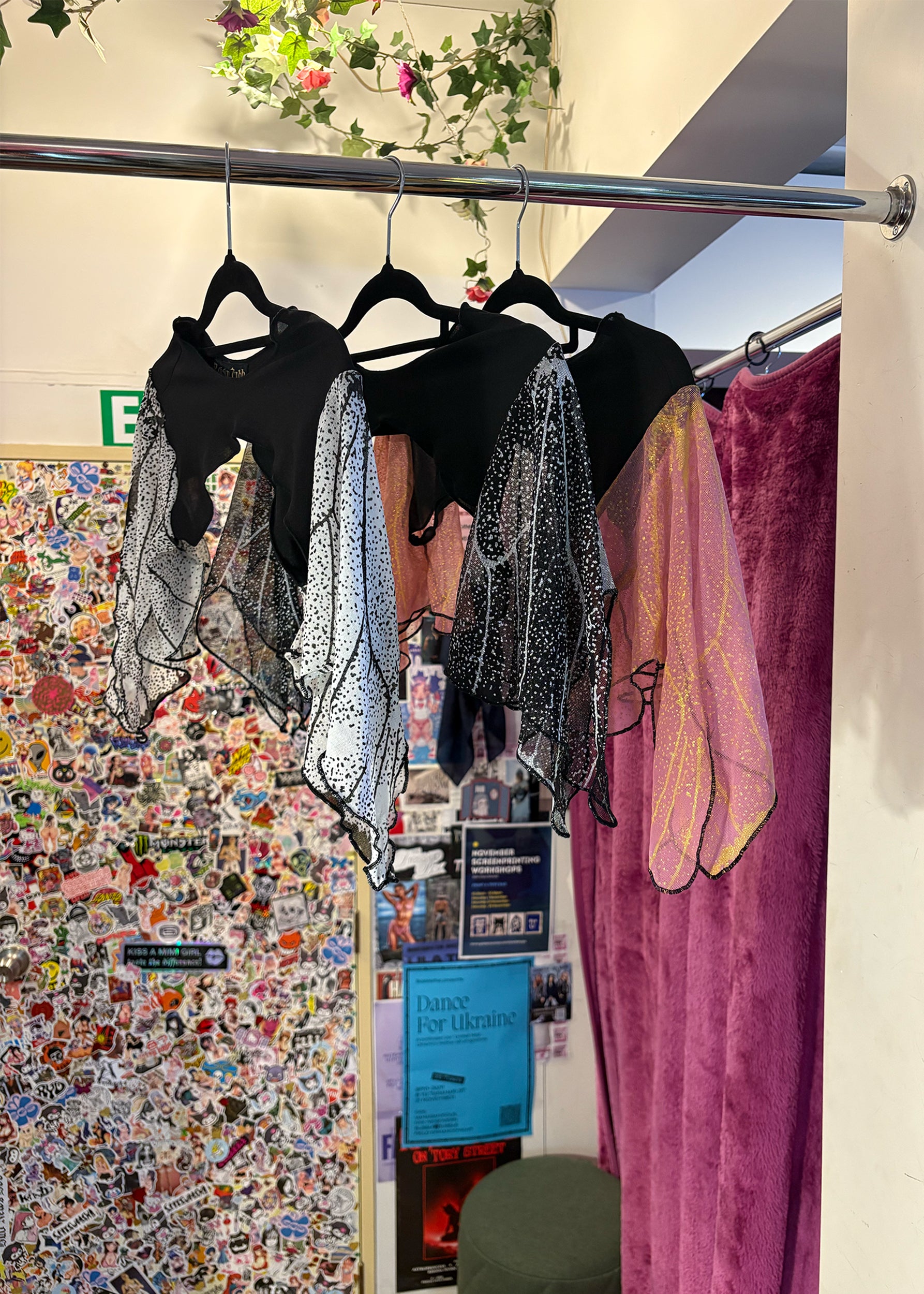 A Roisin Dubh original screen printed butterfly wing bolero/ sleeve layering piece, in black with white screen print