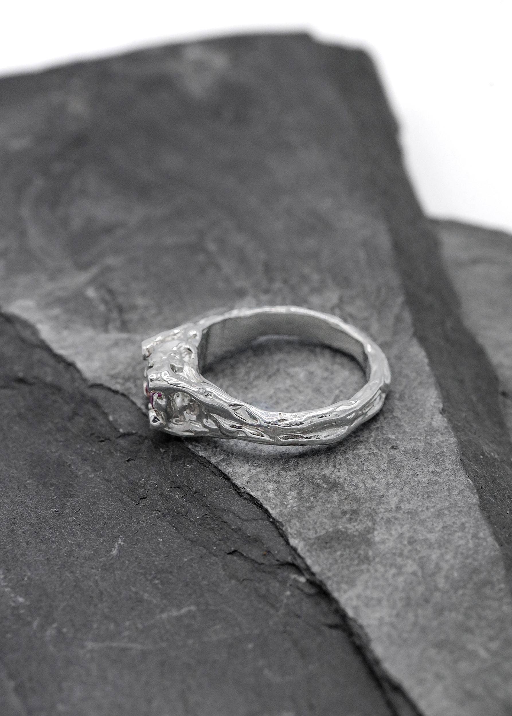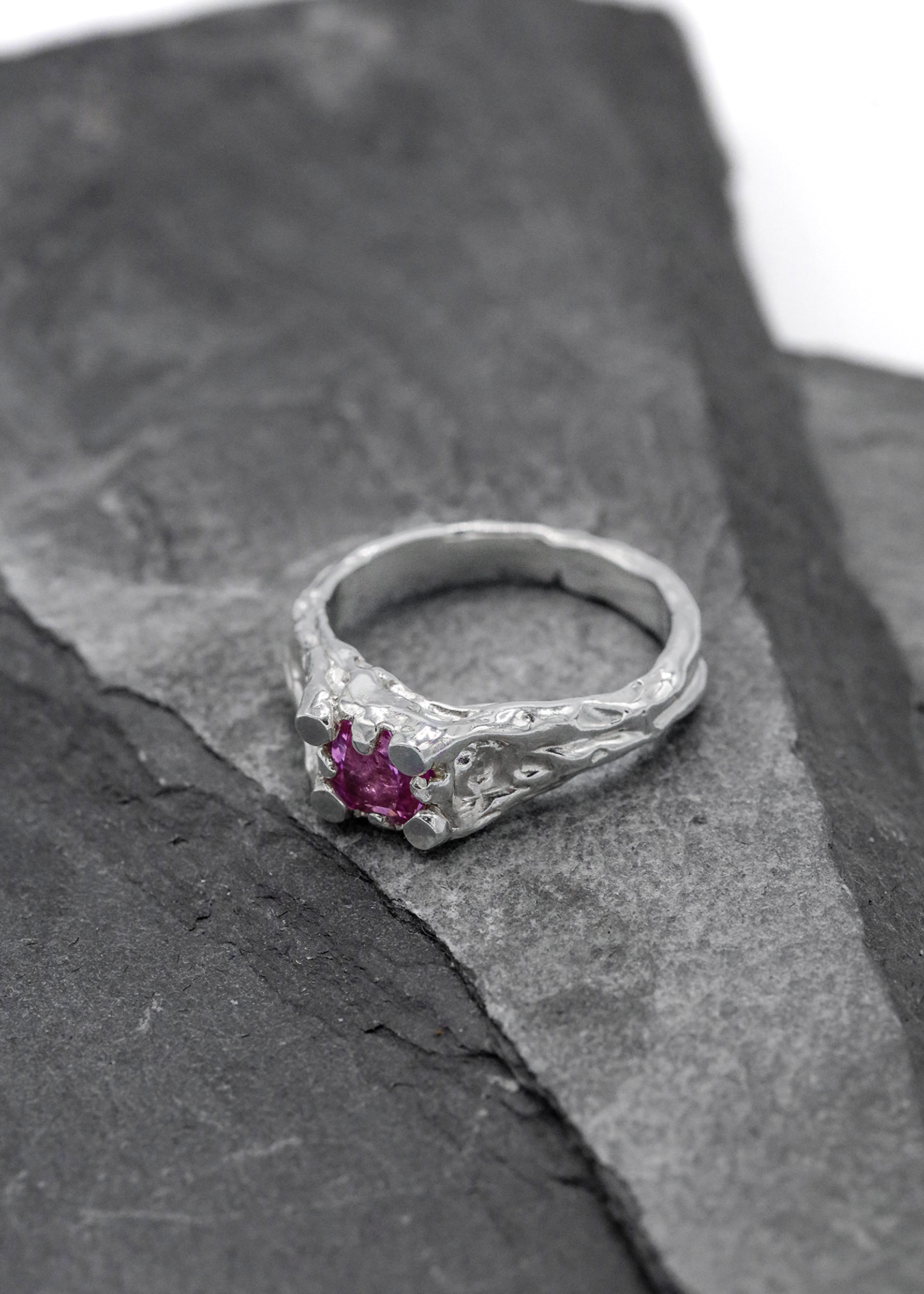 Organic sterling silver ring, set with a single hot pink lab-grown gemstone