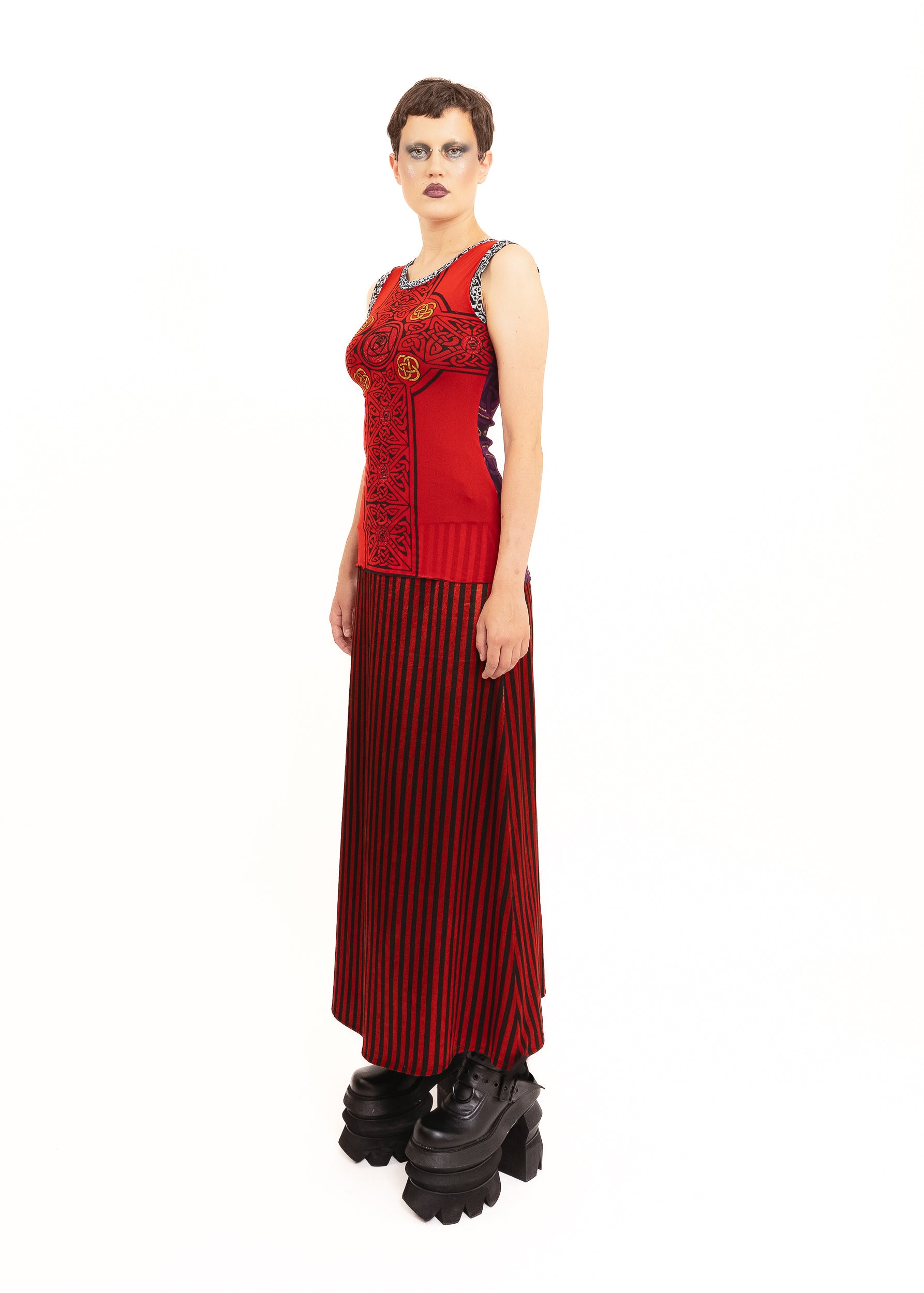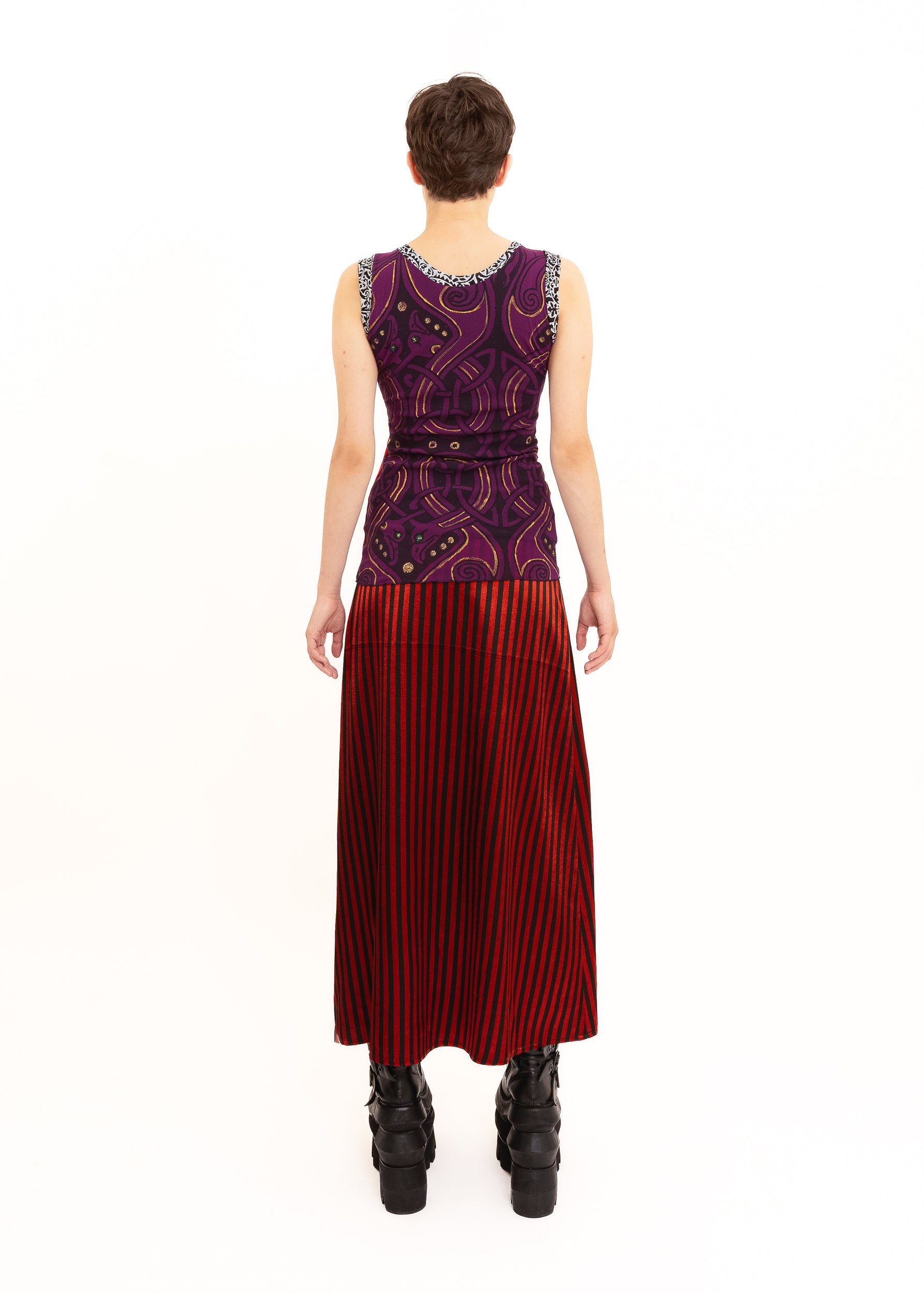 A one of a kind Roisin Dubh creation- a red mesh tank top with a Celtic cross/ rose screen printed front, purple spiral printed reverse and gold glitter detailing