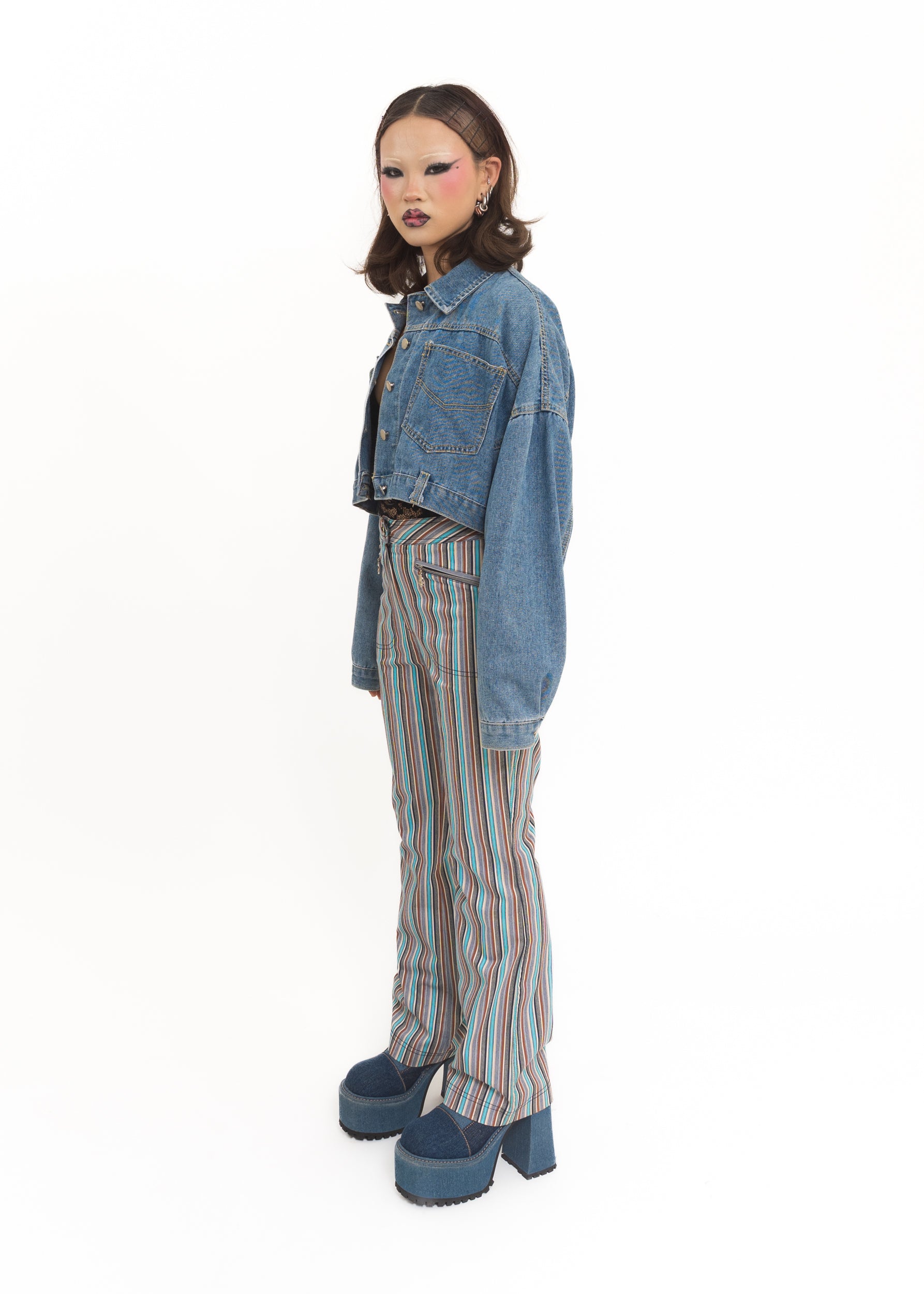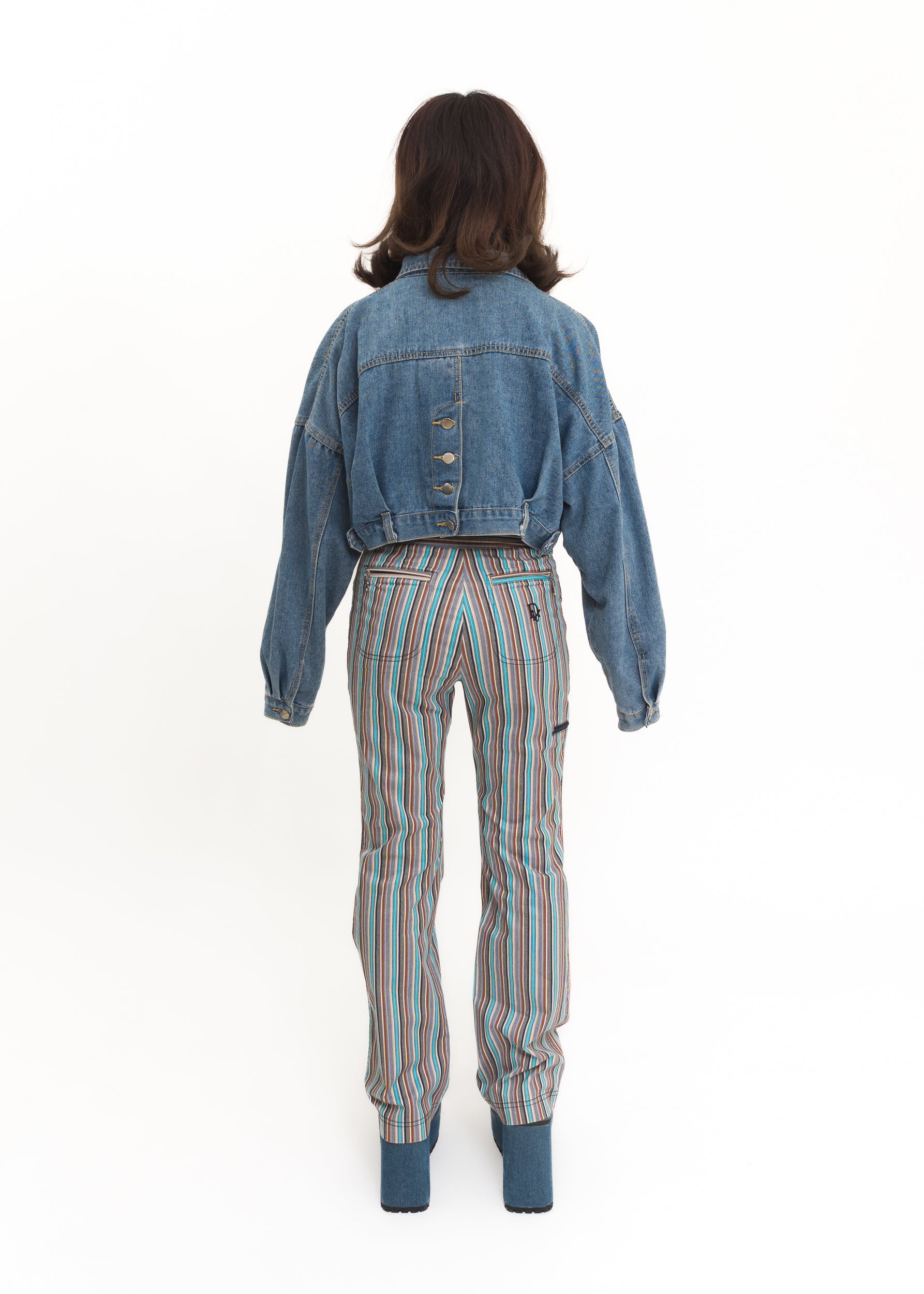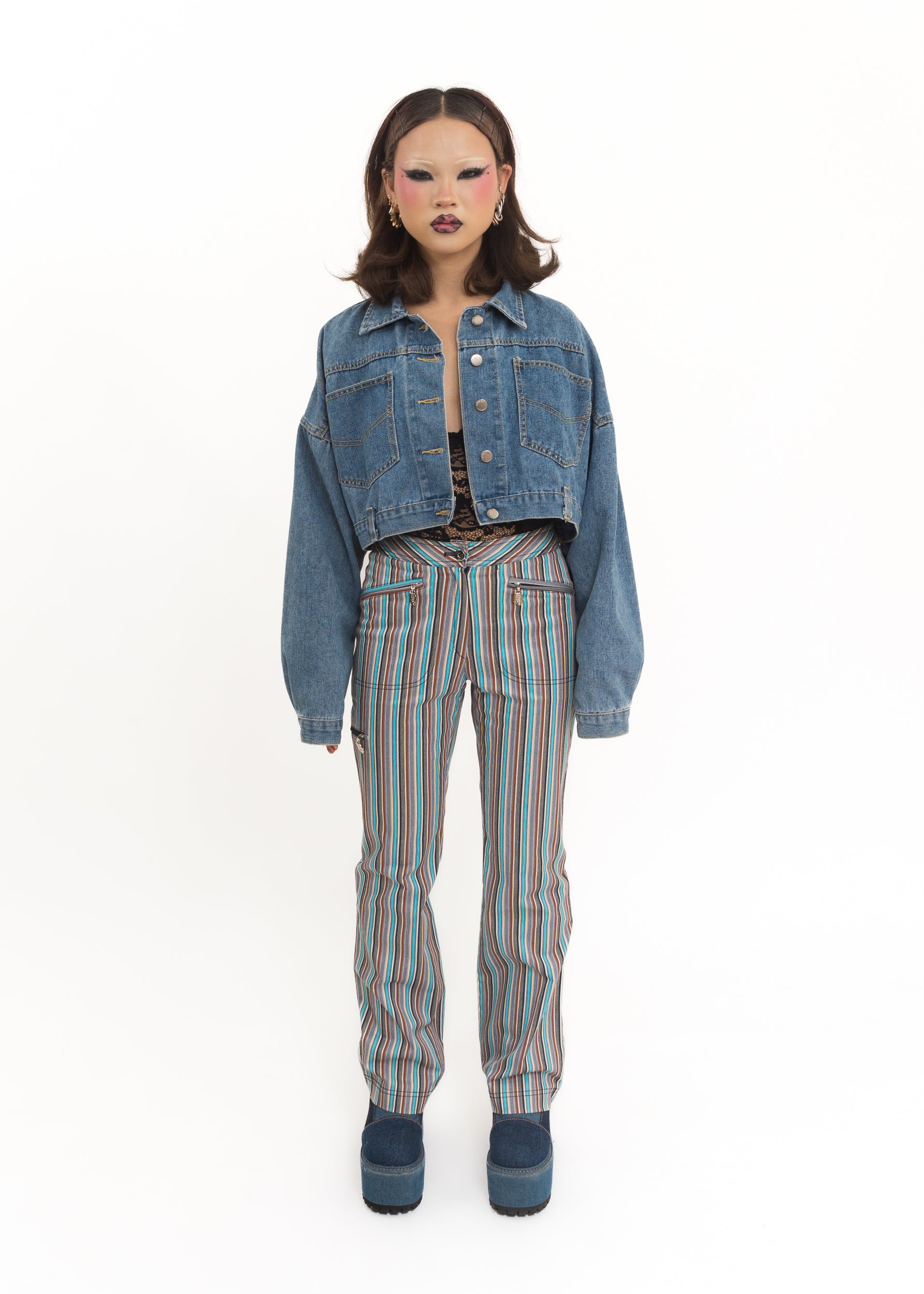 Japanese vintage denim jacket, designed to look like an upside down pair of jeans, with button detailed front and back