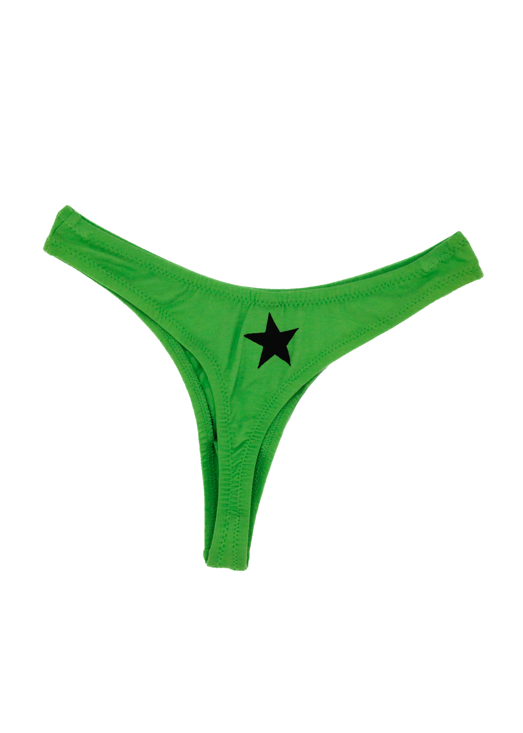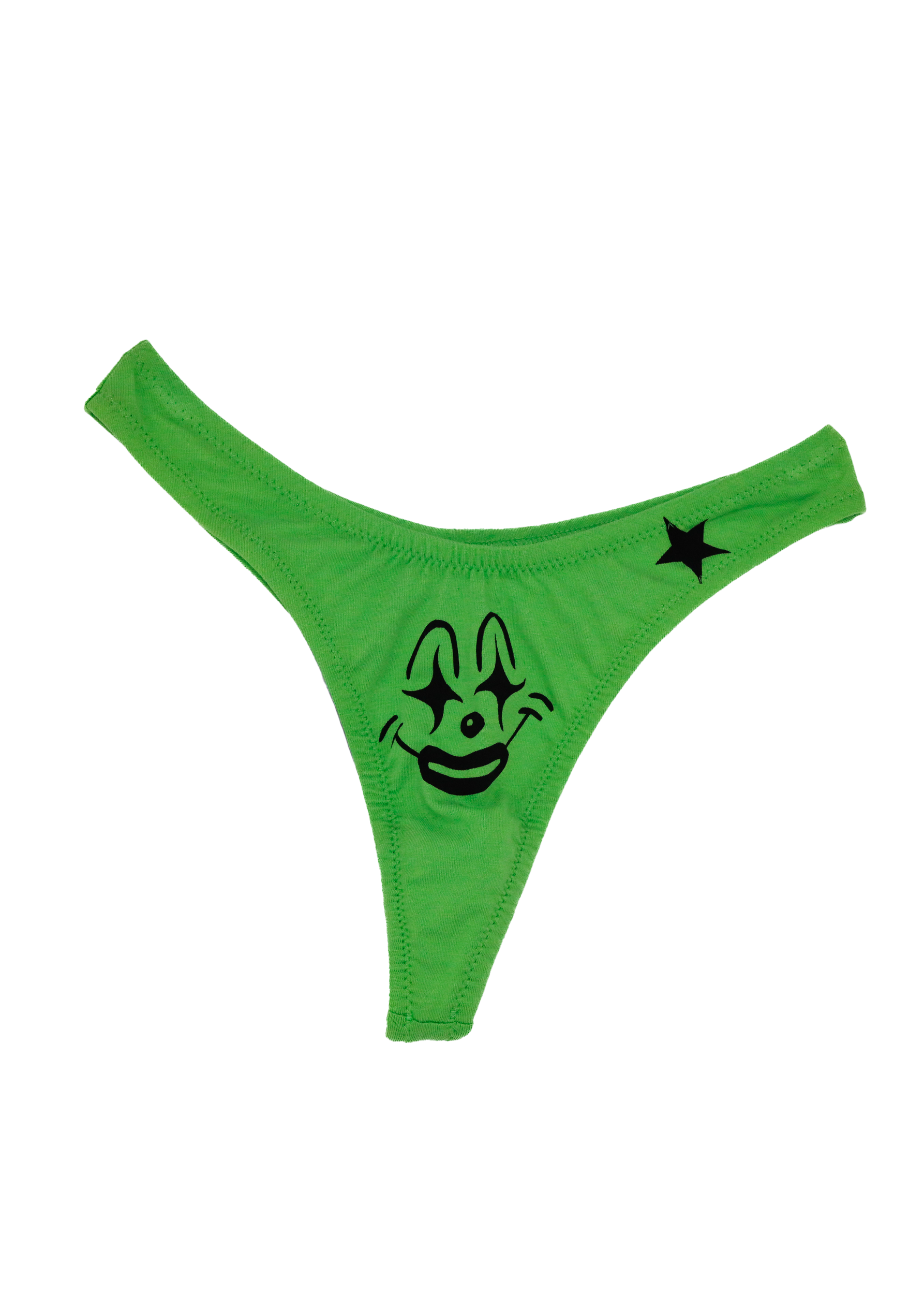 Classic cheeky thong silhouette, with a happy clown screen print on the front, and cheeky star print on the posterior, in a bright green cotton fabrication
