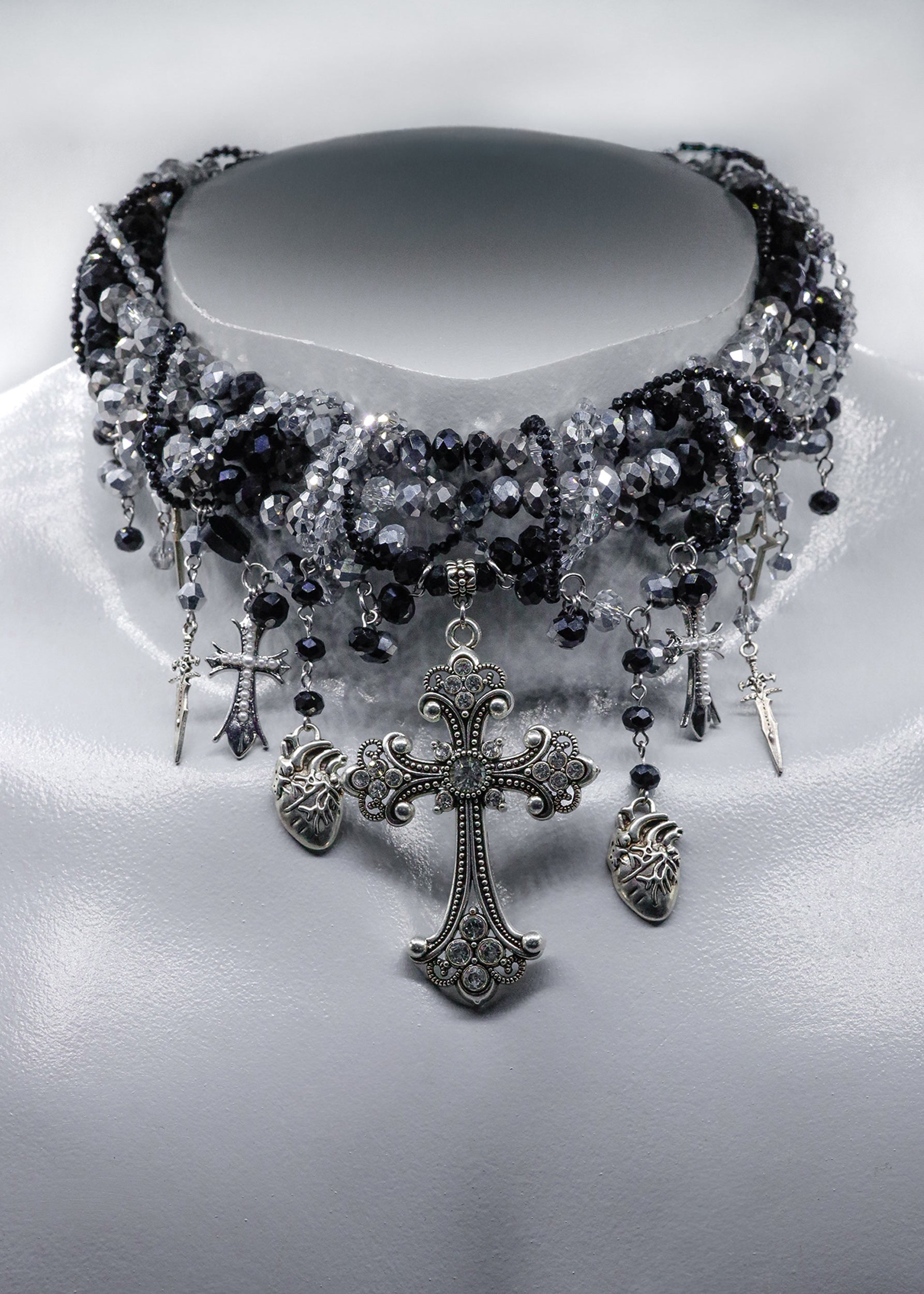 One of a kind handcrafted beaded necklace, featuring numerous interwoven strands and statement crucifix, sword and anatomical heart charms