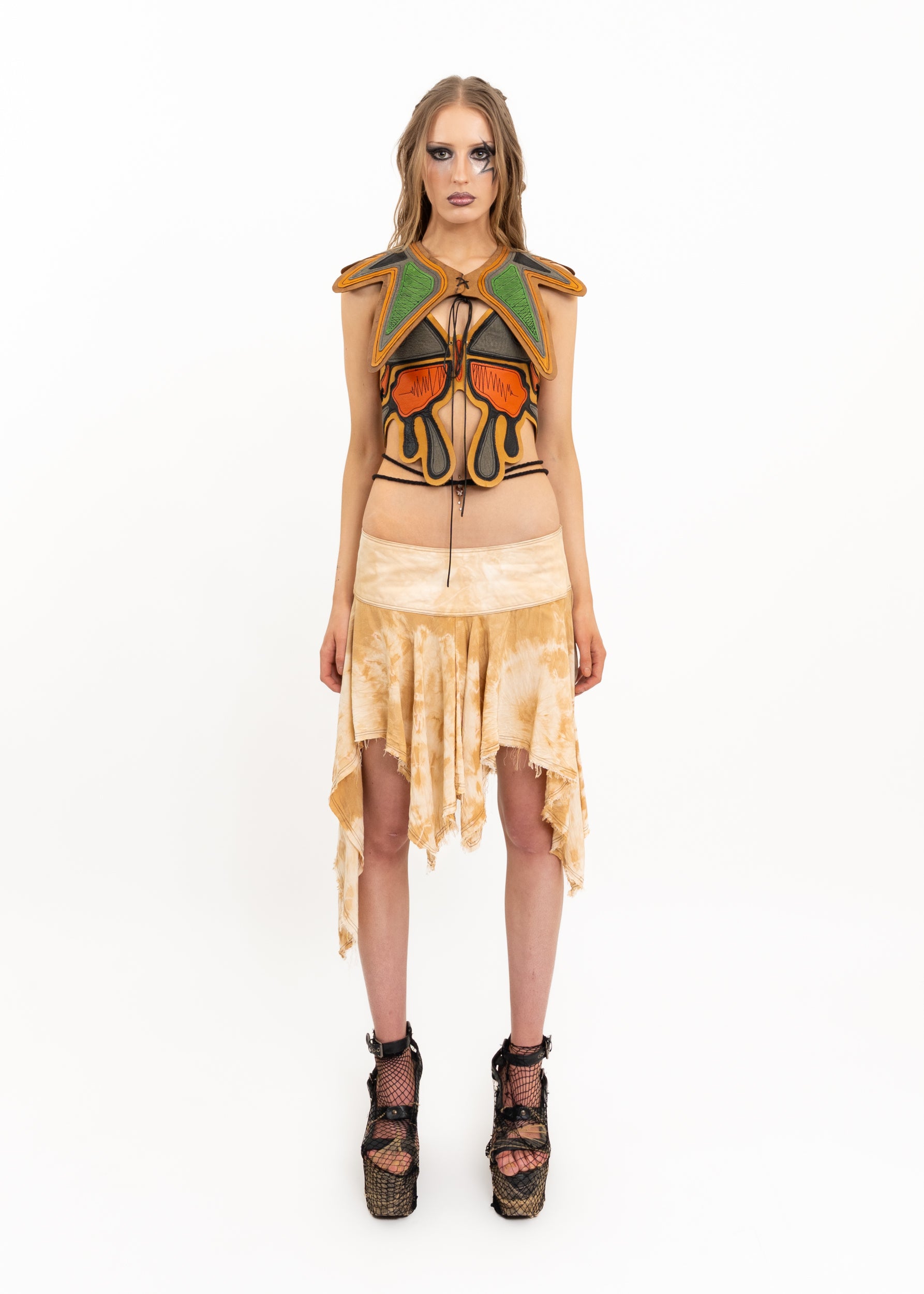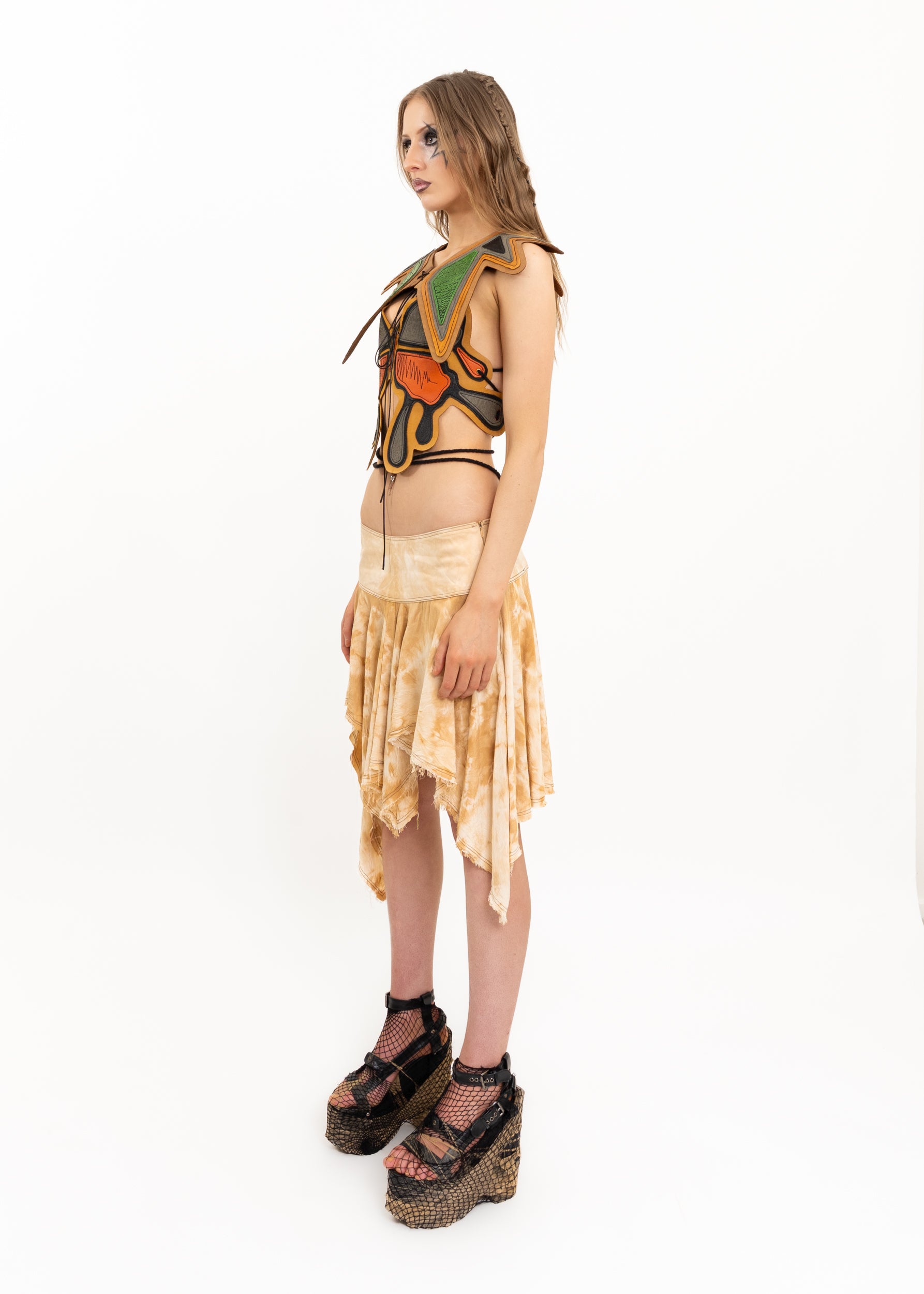 Styled with the eco-dyed scrunched silk skirt and leather butterfly halter top