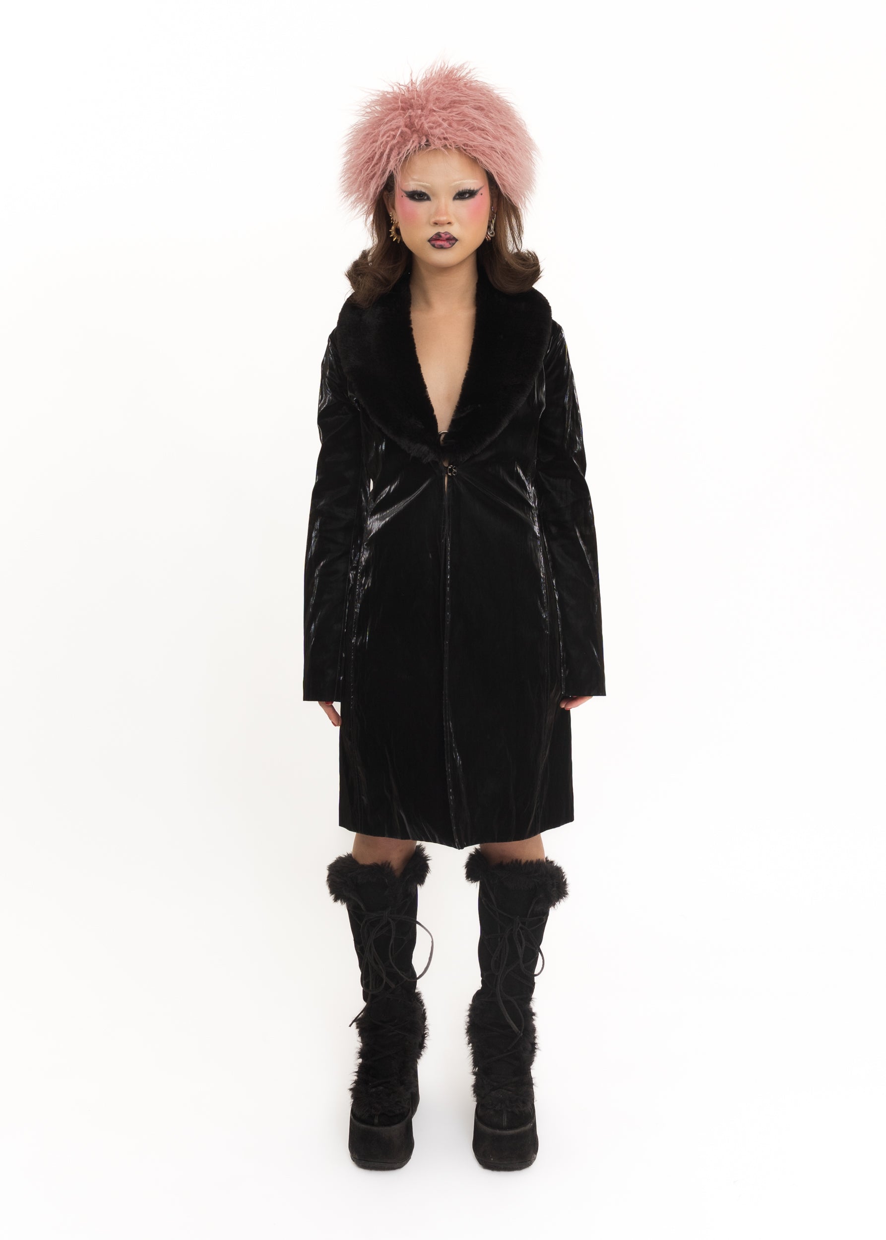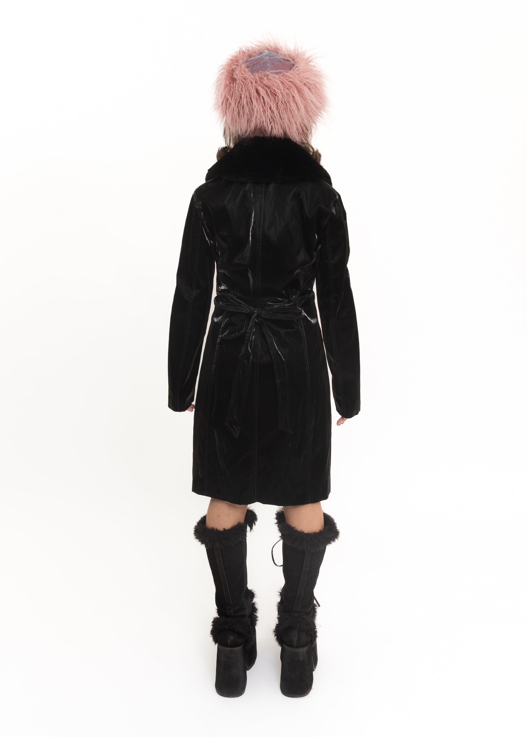 High shine liquid latex feel coat, with faux fur collar and belt tie fasten