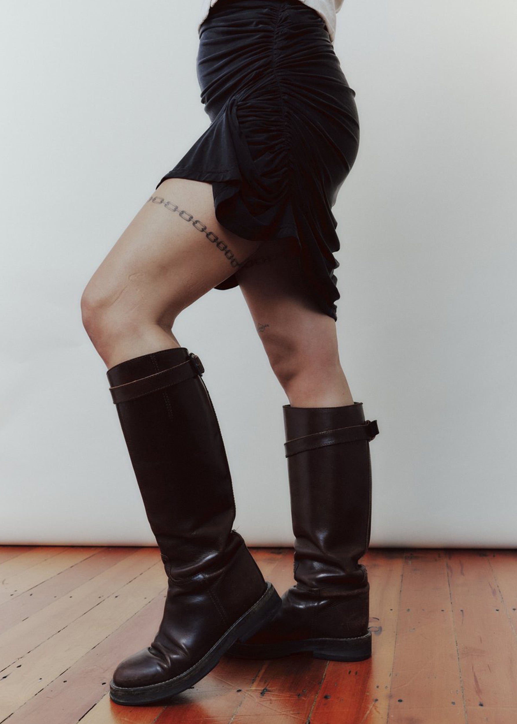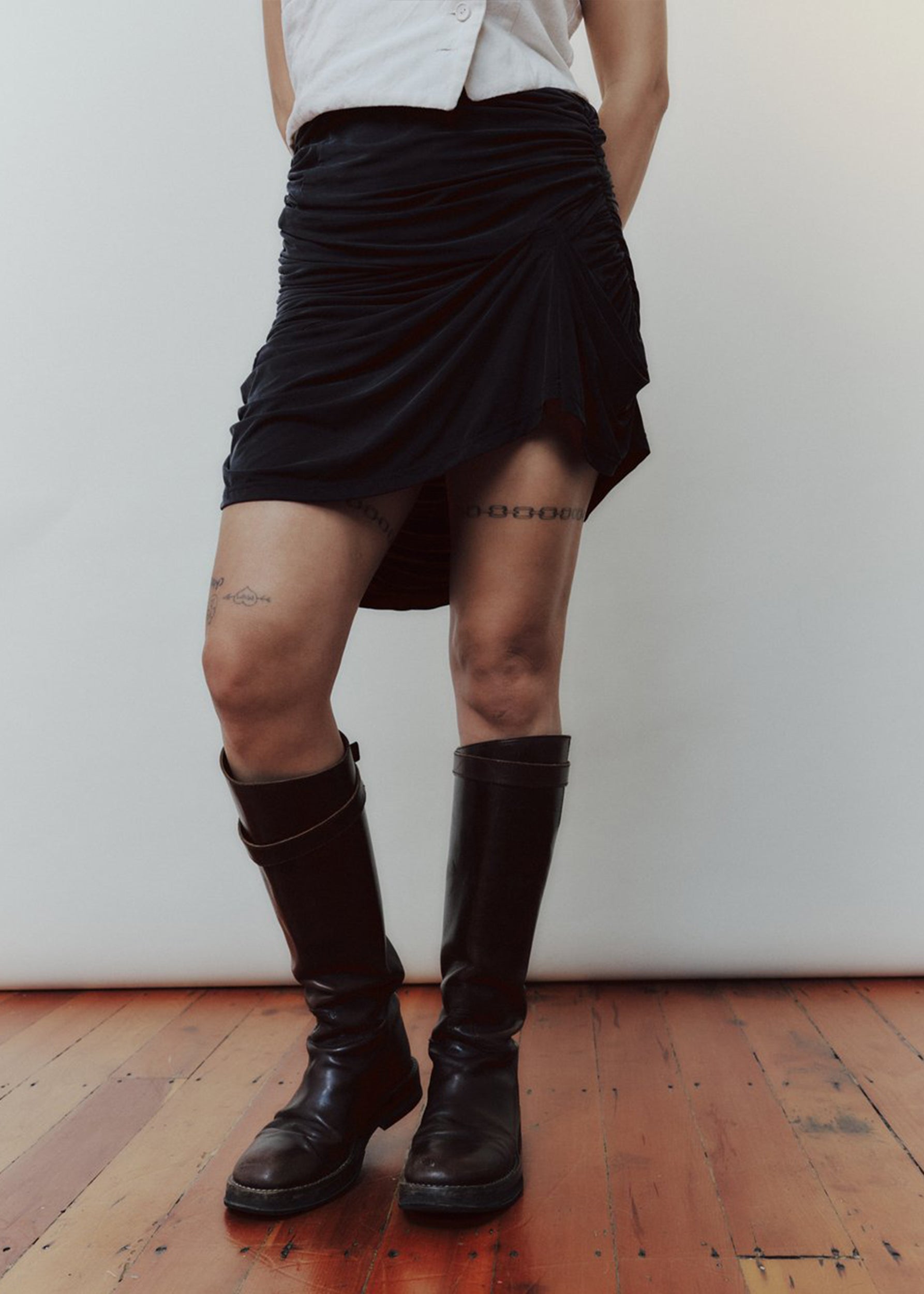 Asymmetric draped mini skirt in sand washed black cupro with two panels wrapping around the body and gathered at the side seams, featuring a twist on the left side