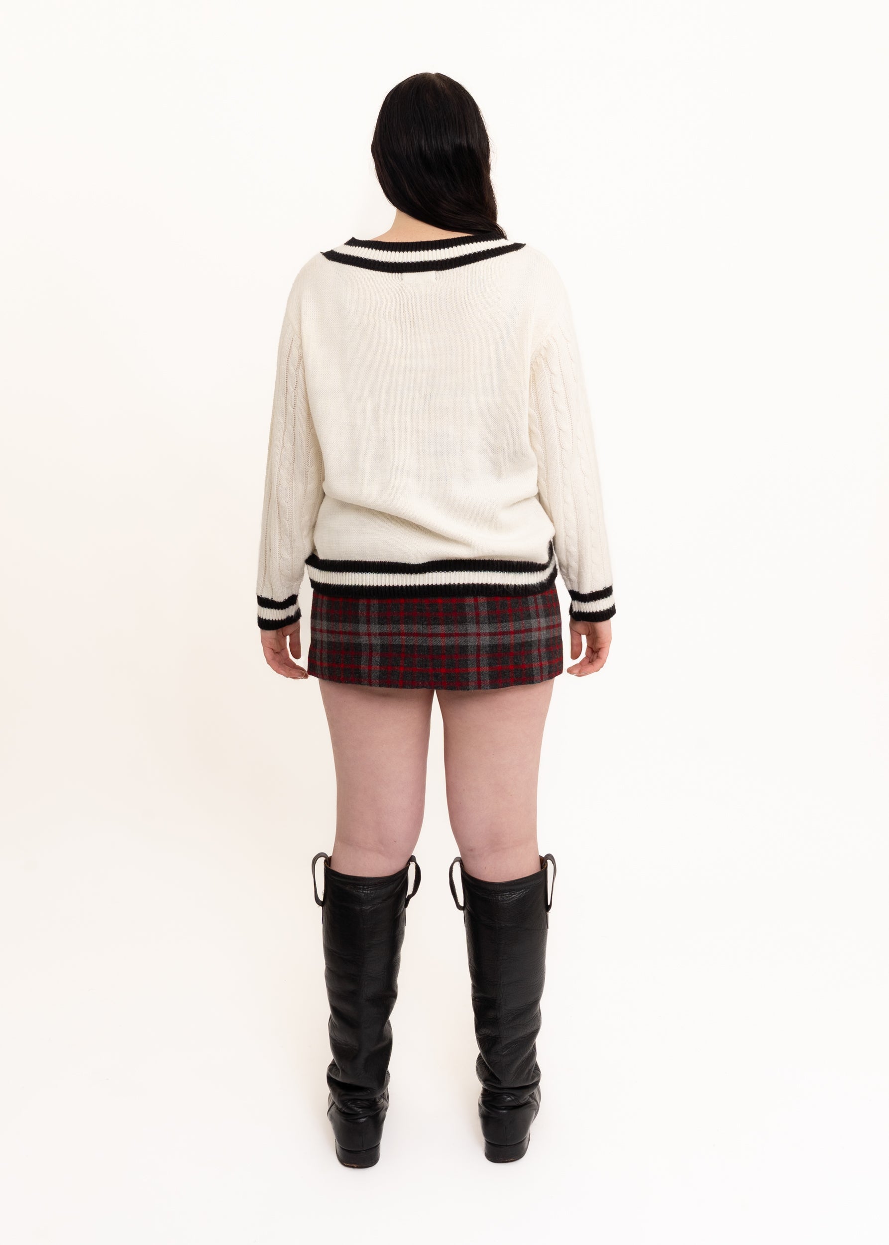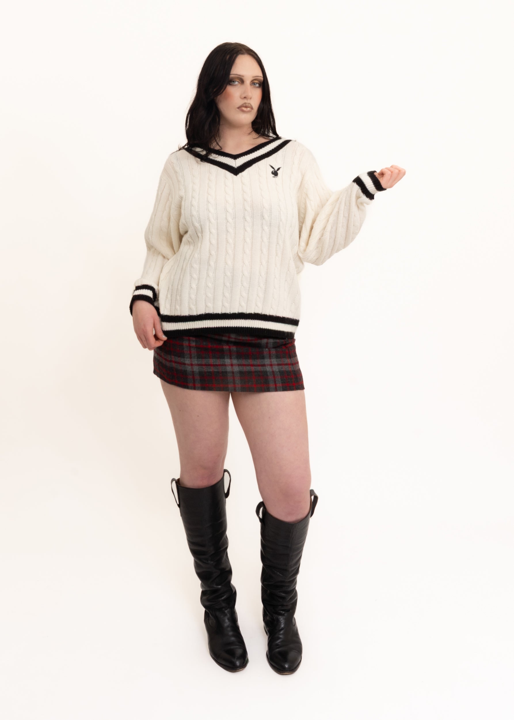 Playboy varsity style v-neck cable knit jumper with contrast embroidered logo and stripe ribbed trims trims