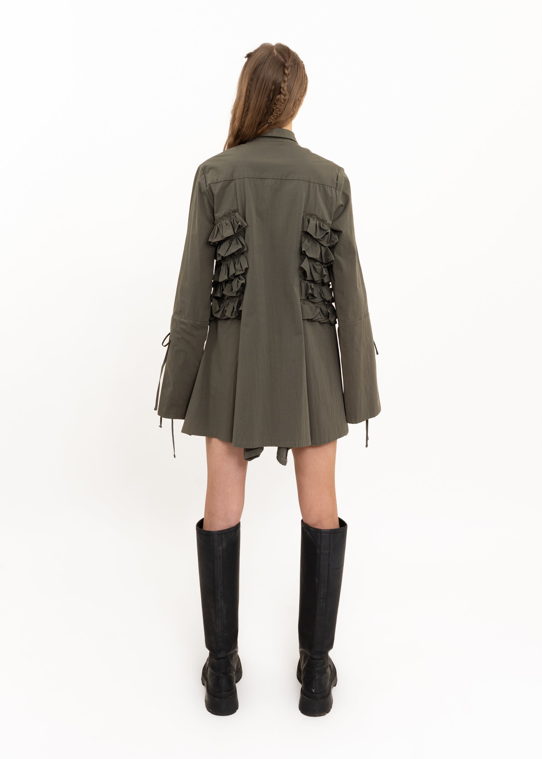 Ruffle front shirt dress, featuring pleated body, dome closure and lacing details at wrists