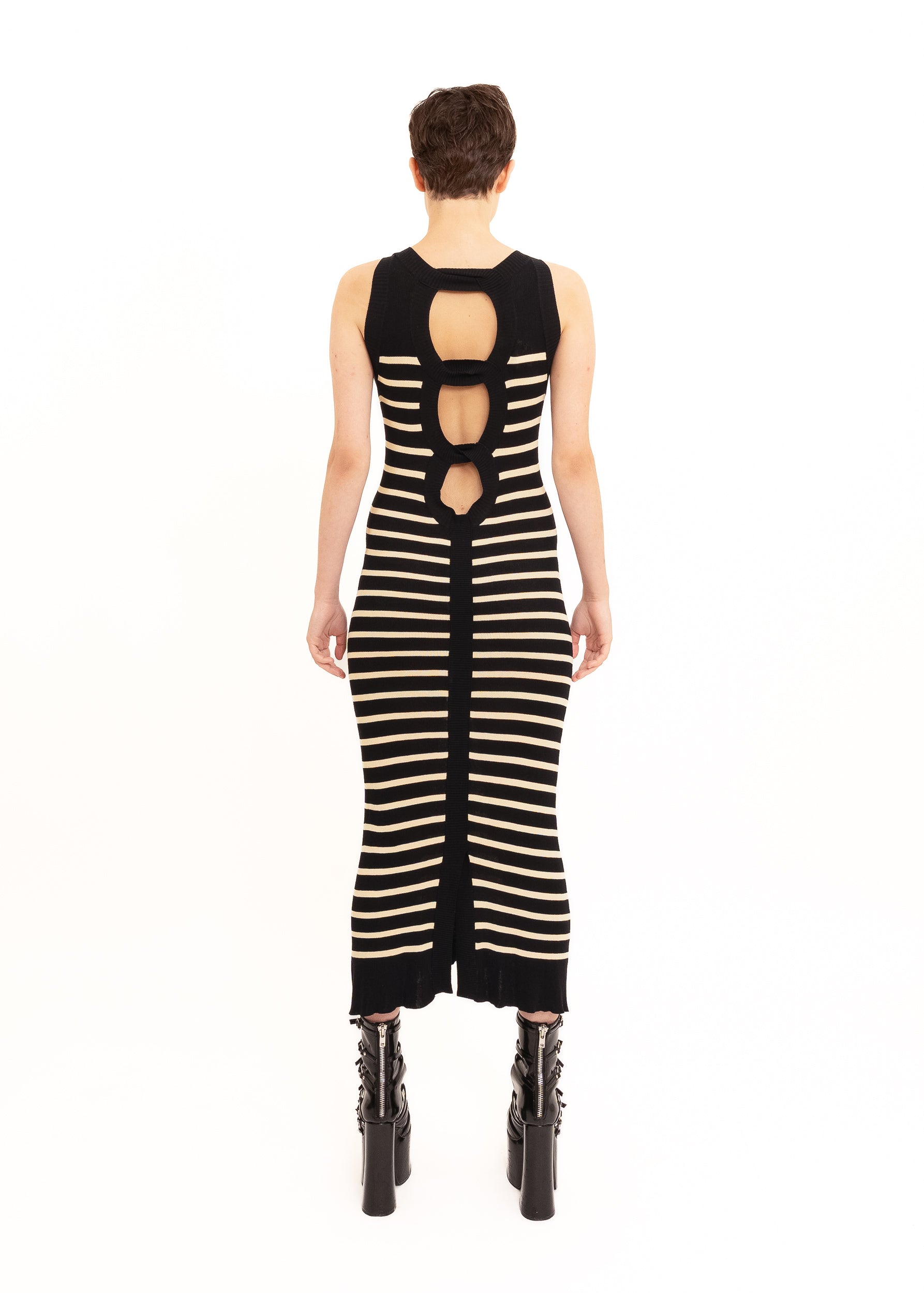 Jean Paul Gaultier Maille Femme striped bodycon knit maxi dress, with open back cut out detailing (alternately, if you're feeling particularly saucy, the cut outs can be worn at the front...)