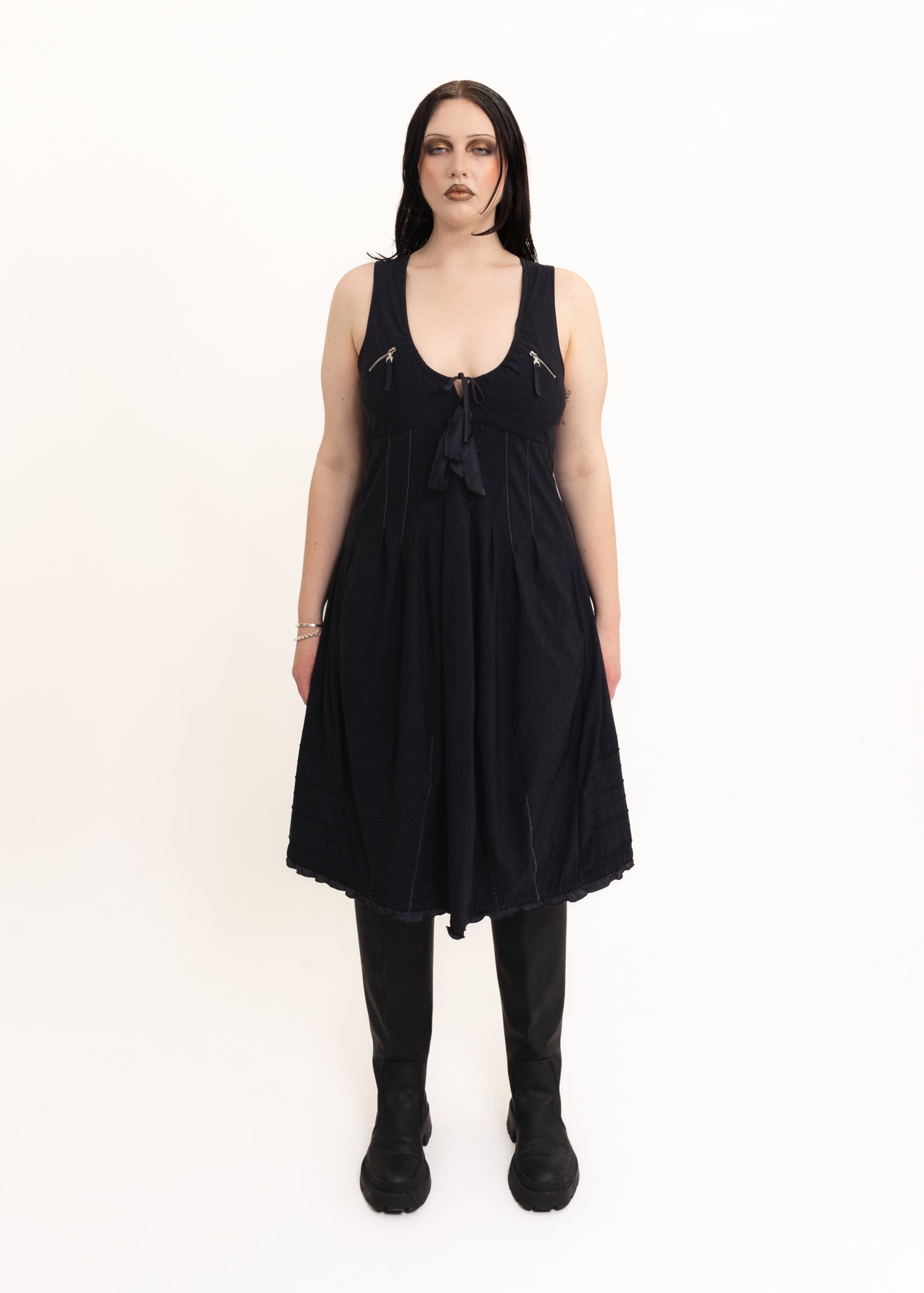2000s Marithe + François Girbaud dress with zipper detail, bow tie details at the bust, panelling through the body, contrast stitching and gathered bubble/ balloon hem