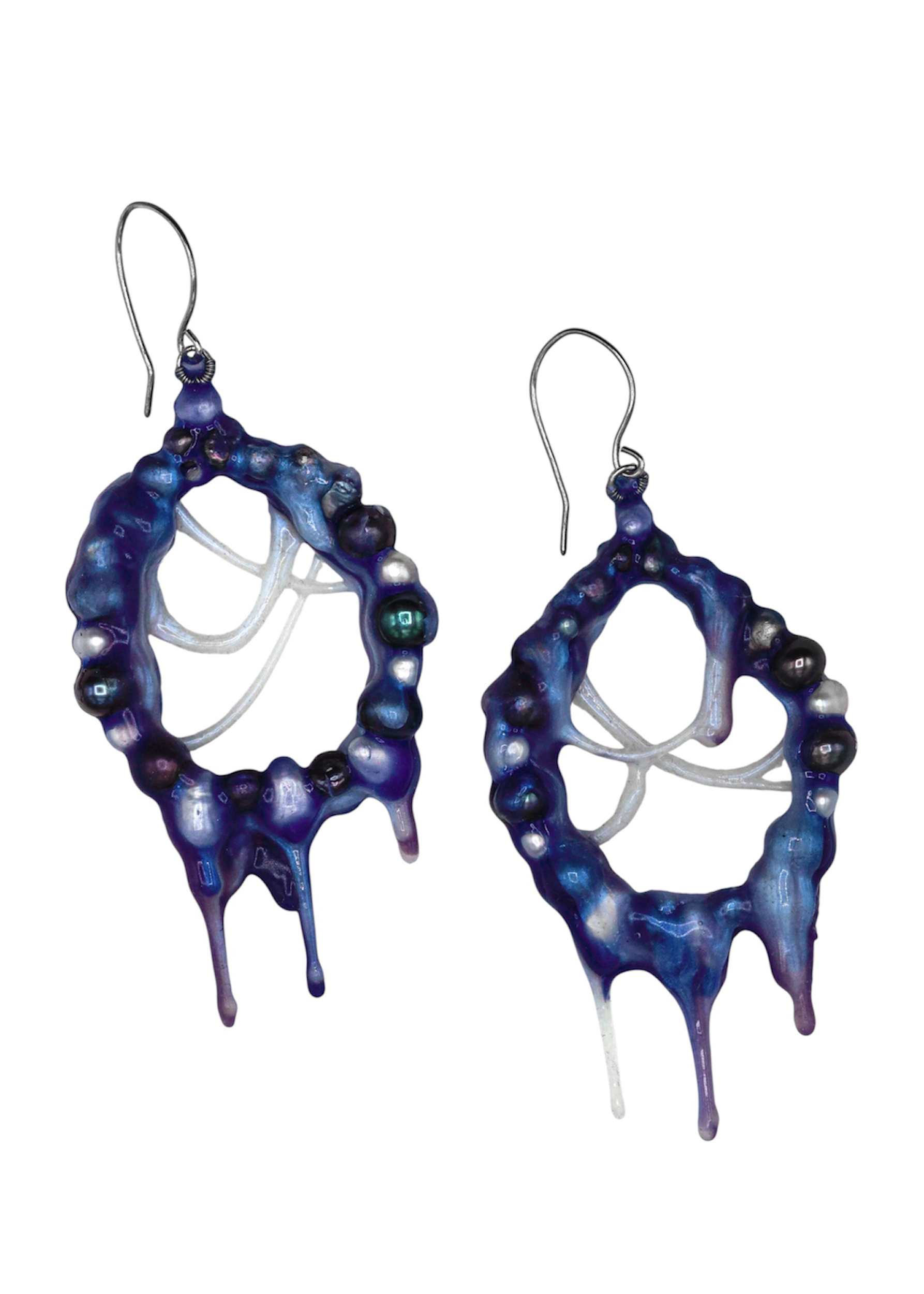 A pair of tear-drop shaped black and white freshwater pearl earrings, drenched in indigo and iridescent blue silicone