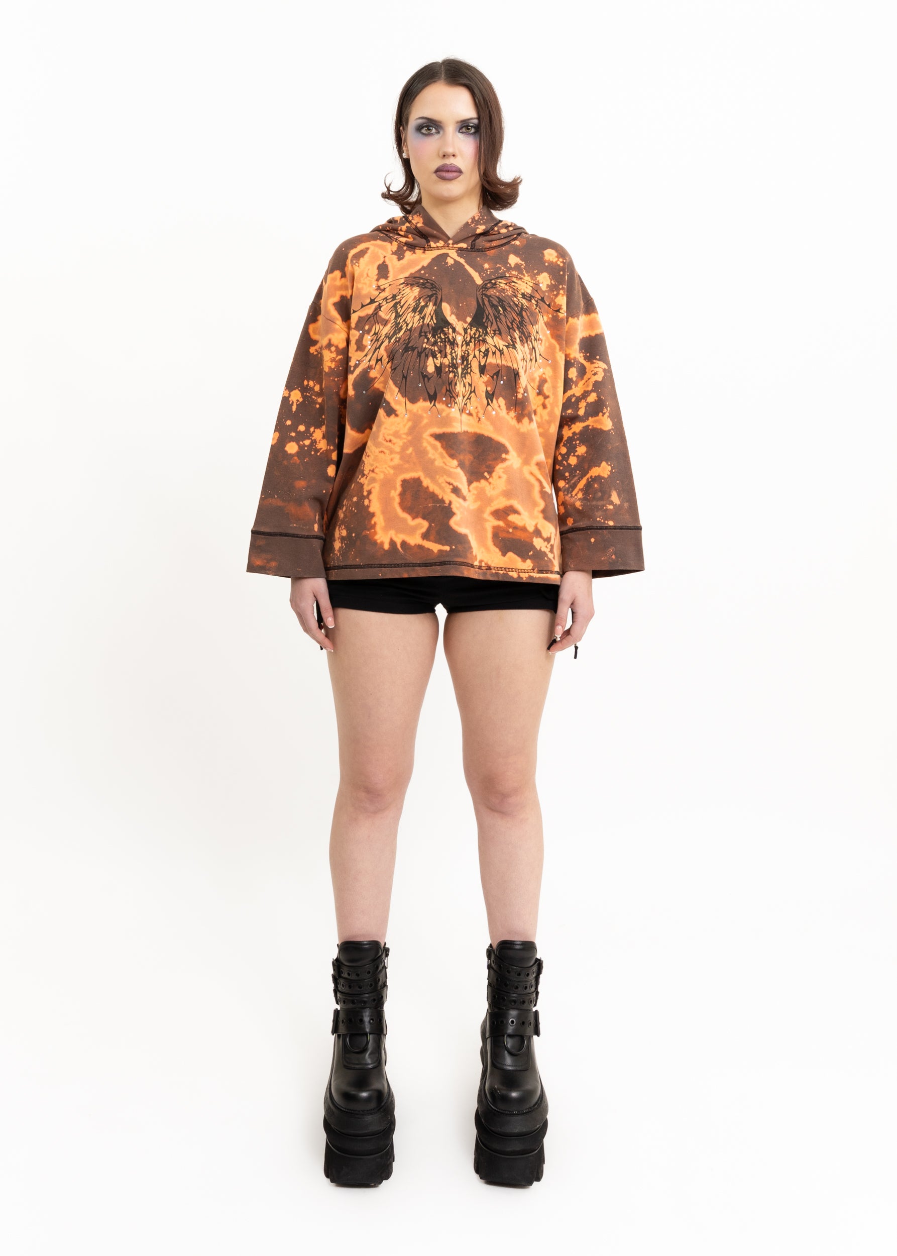 Bleached screen-printed long sleeved hooded t-shirt, featuring an original angel wing print, hot fix rhinestone bedazzle and all-over bleach splatter
