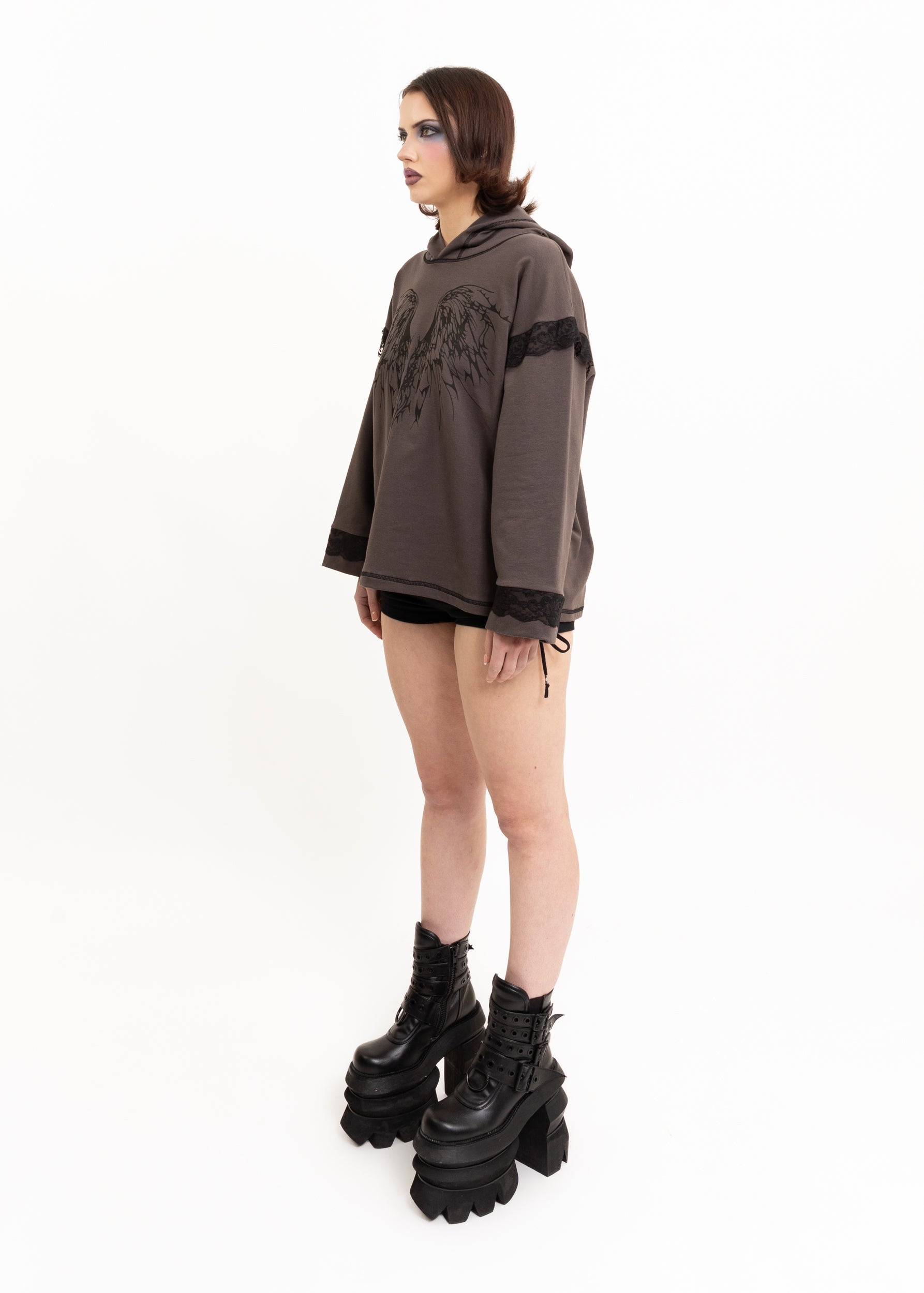 Screen-printed long sleeved hooded t-shirt, featuring an original angel wing print and contrast black lace trim