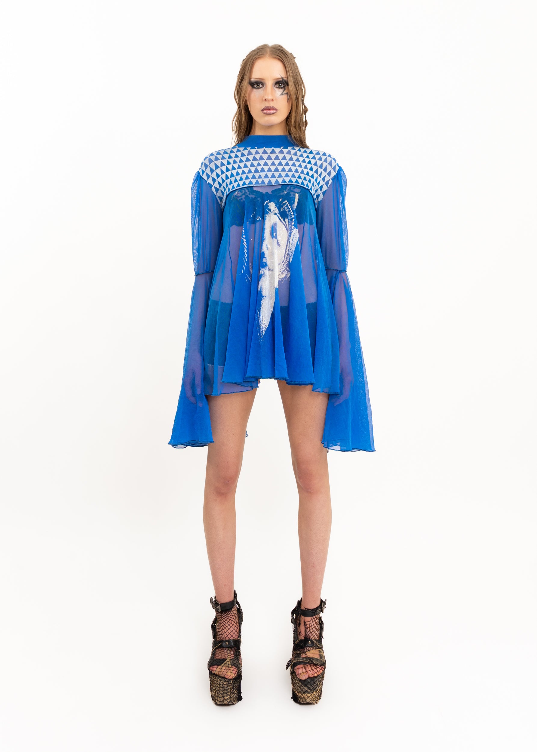 A one of a kind Roisin Dubh creation- a mesh babydoll tunic/ micro mini dress with voluminous batwing sleeves and white contrast screen print