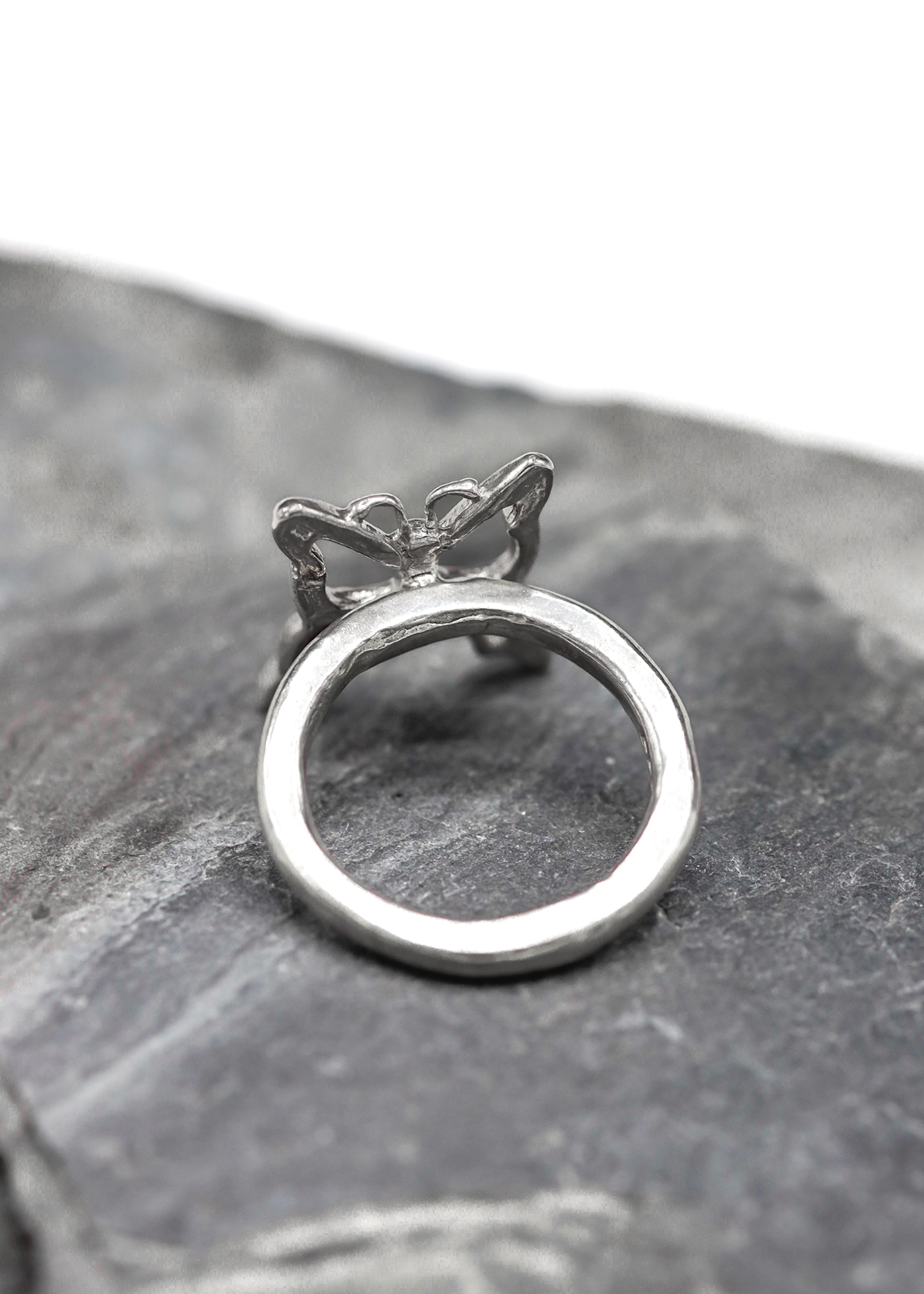 A sterling silver ring, set with a single red lab-grown ruby, in the shape of a butterfly