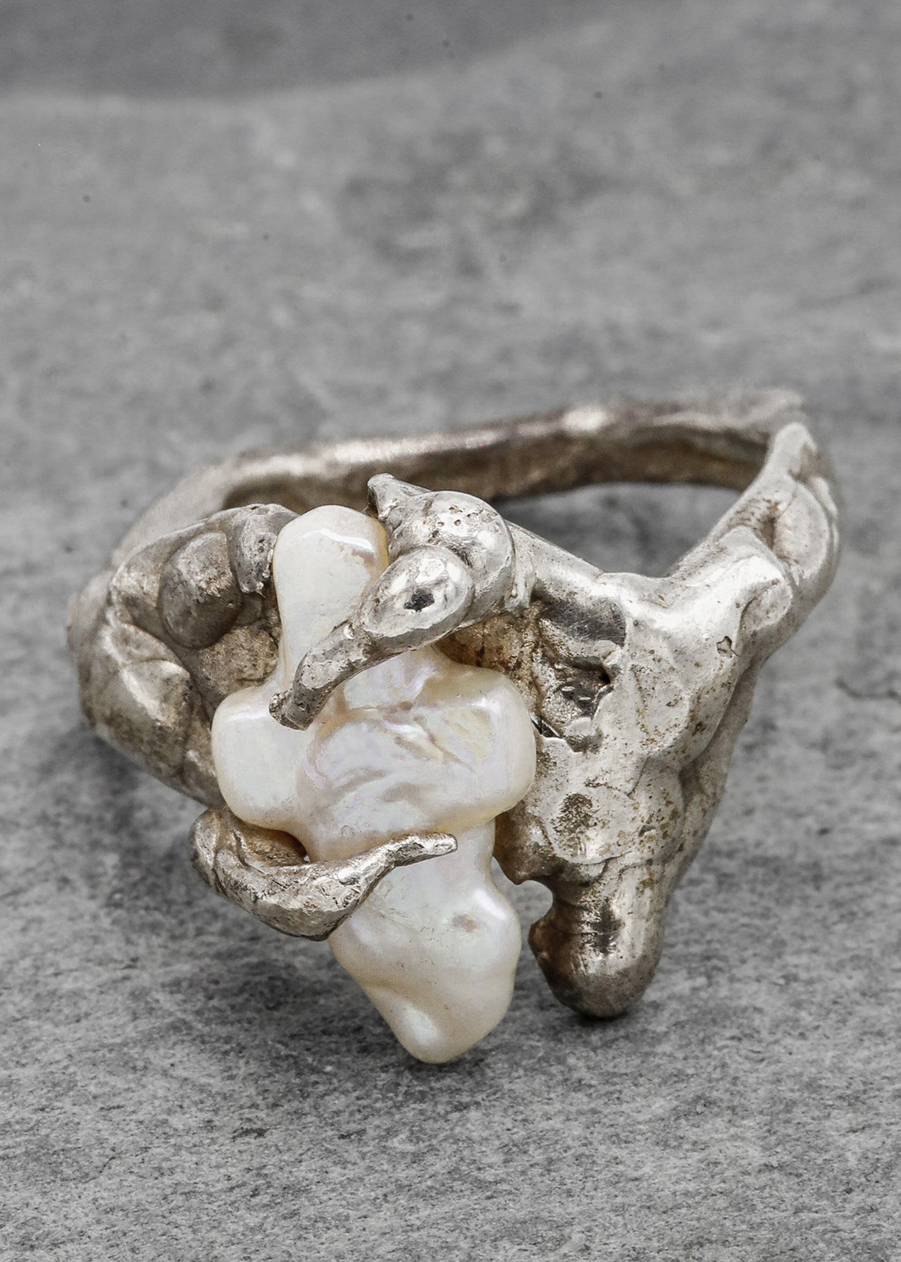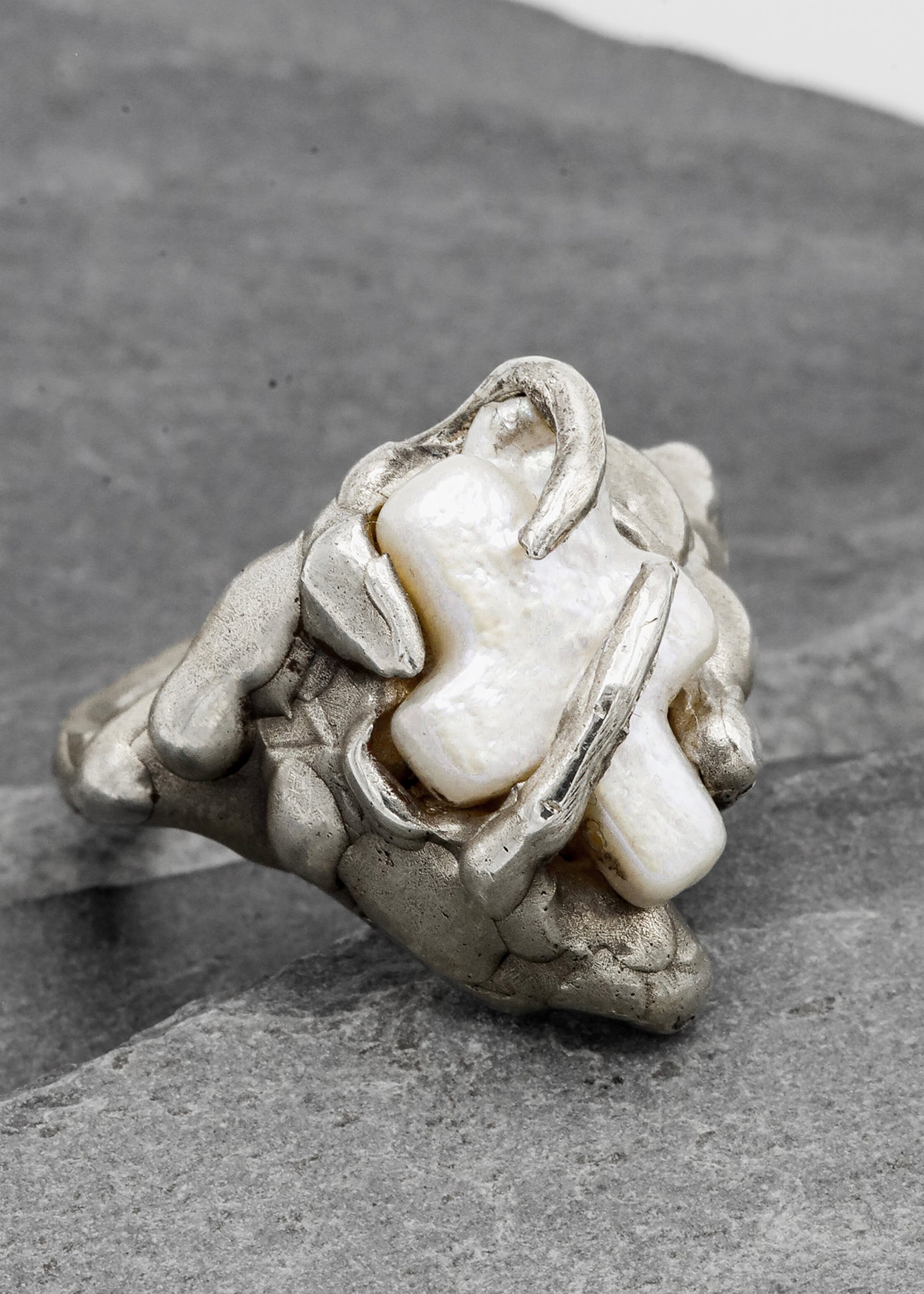 Organic hand sculpted sterling silver ring, set with a cross-shaped freshwater pearl