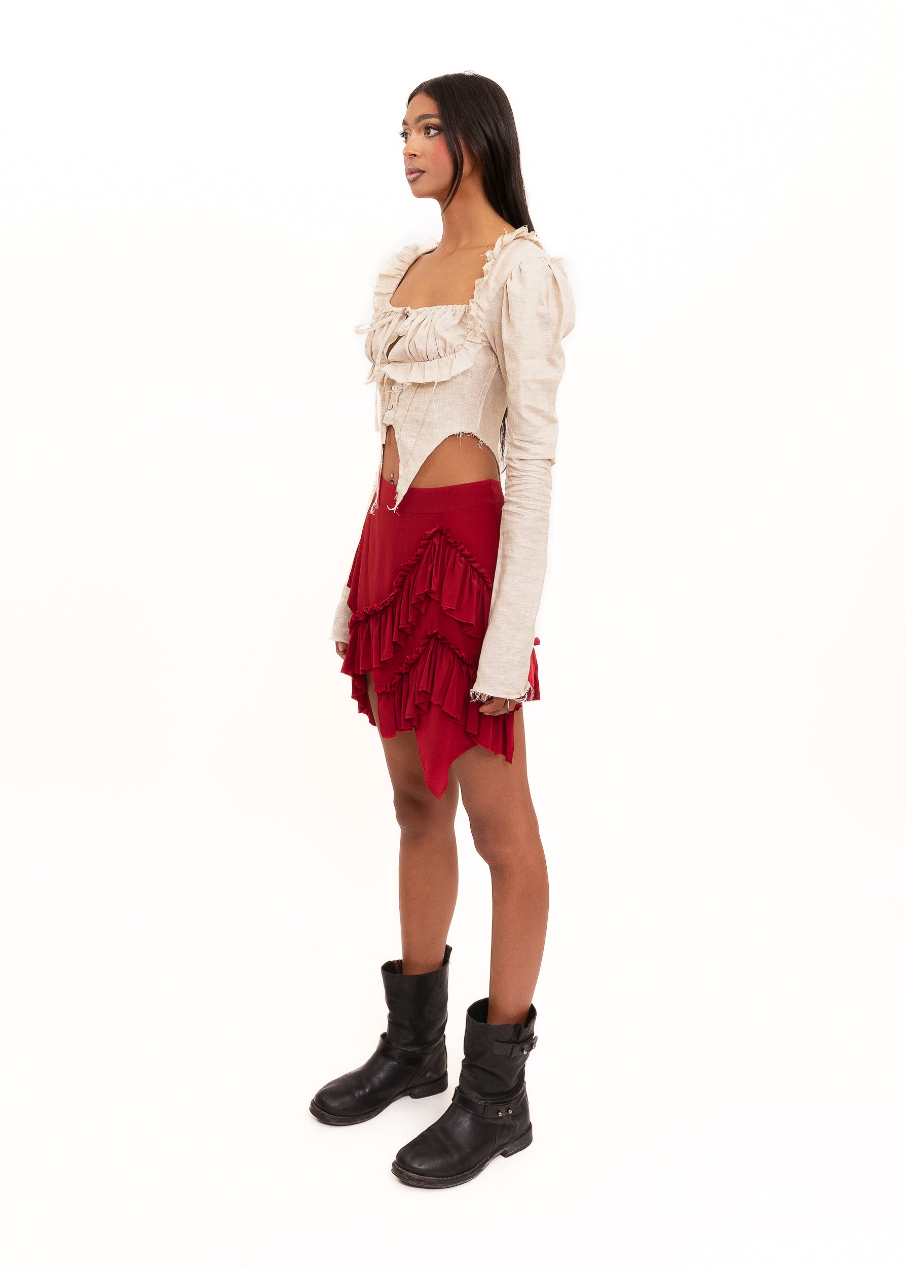 Inspired by regency-era Spencer jackets, the Dove Top is a modern day reiteration featuring extra long mutton sleeves, a square neckline lined with ruffles, and an open back secured by two long ribbons