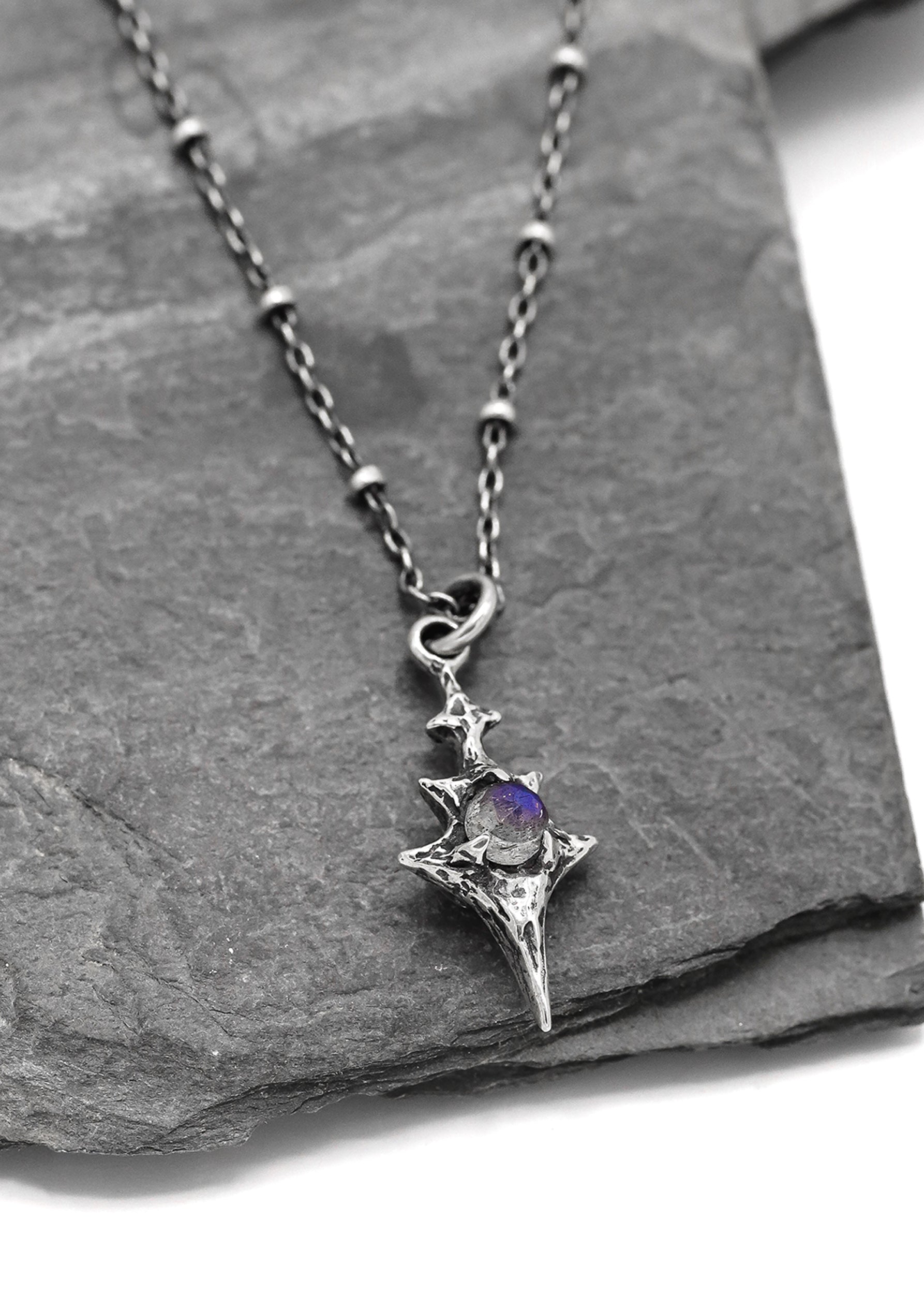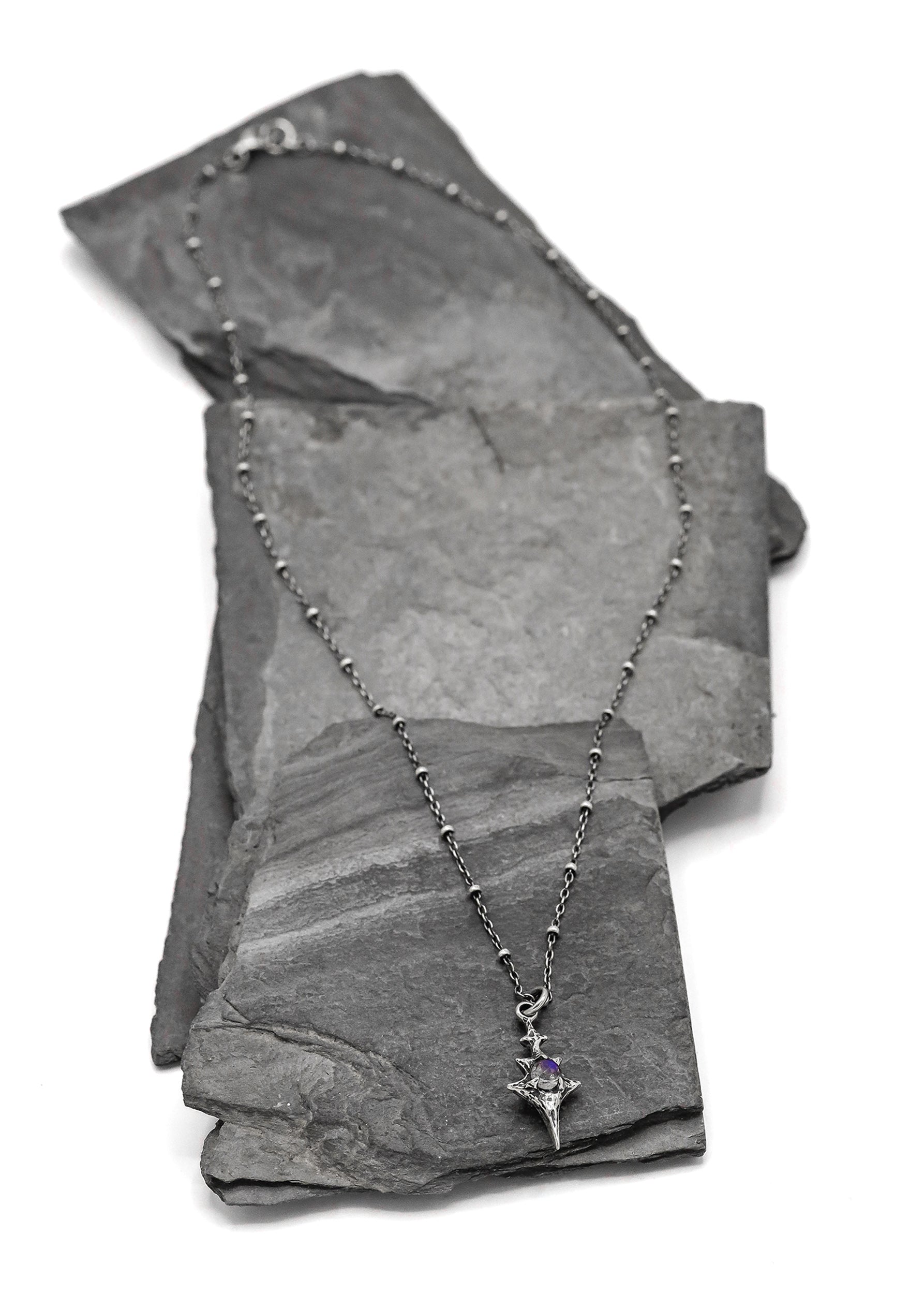 A spiked sterling silver pendant, set with a garnet, sits upon a 16 inch/ 40 cm antique matte finish sterling silver satellite chain