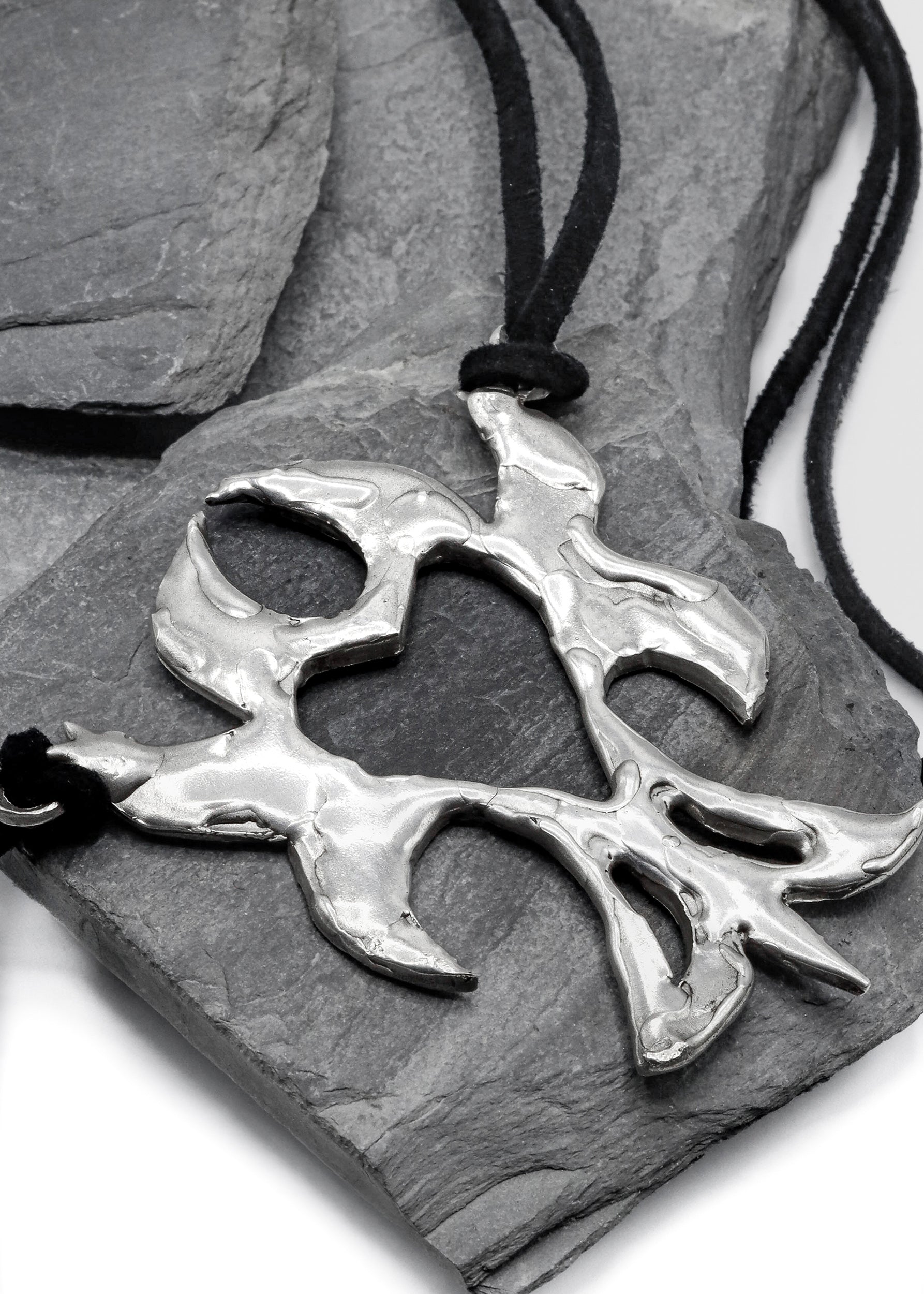 Sterling silver charm spiky heart-shaped pendant on a black faux suede cord belt, designed to be worn as either a belt or necklace