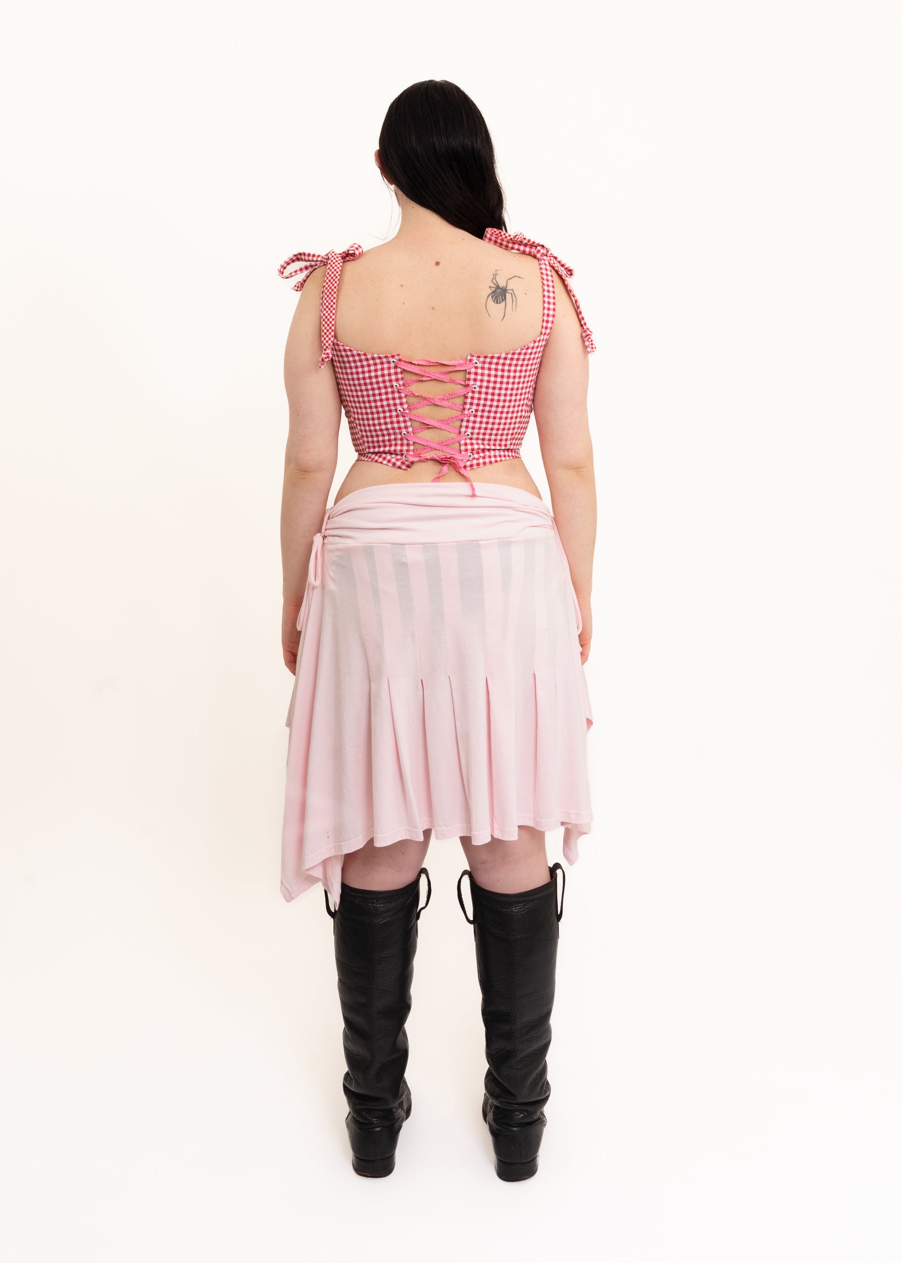One of a kind boned corset, in pink and white cotton gingham with a white lace trim
