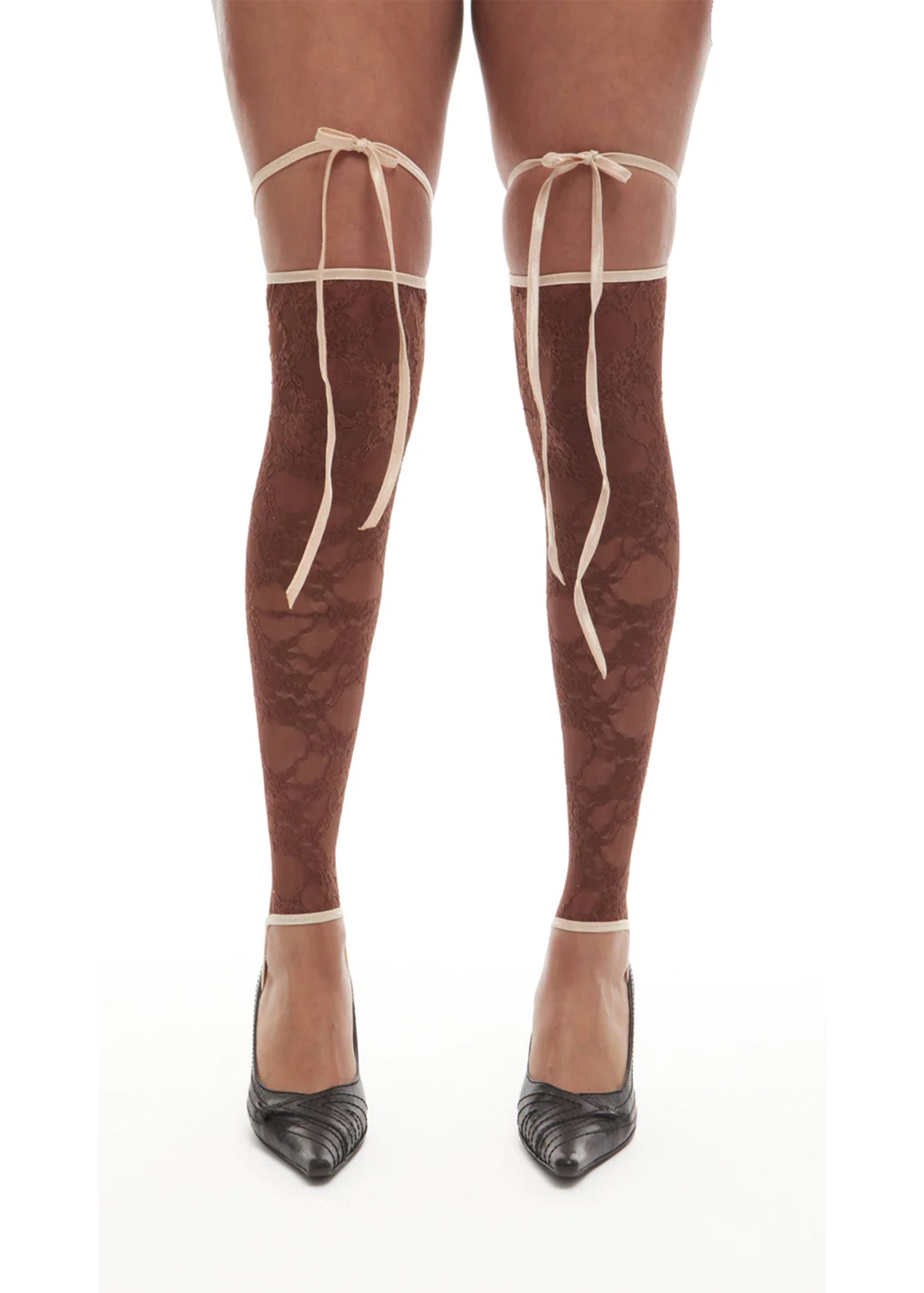 Chocolate brown stretch lace stockings, with a contrast ivory elastic trim, stirrup and tie top