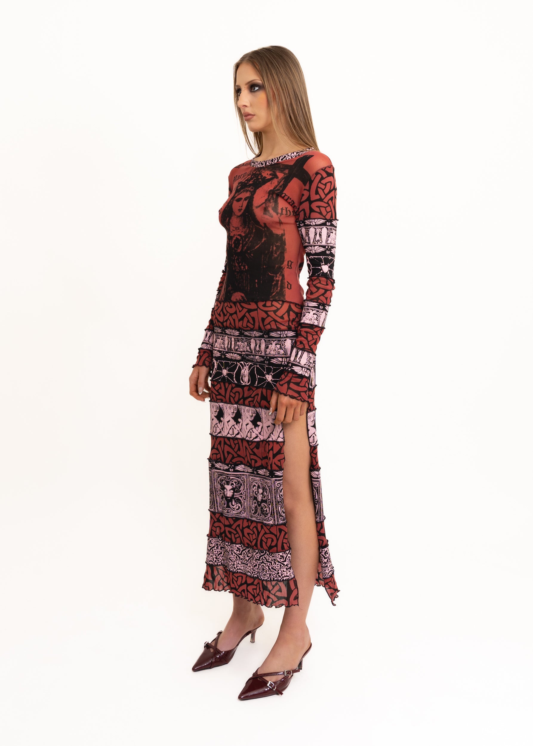 Long sleeve mesh maxi dress, with side splits, featuring an original Hail Mary screen print, and Celtic iconography