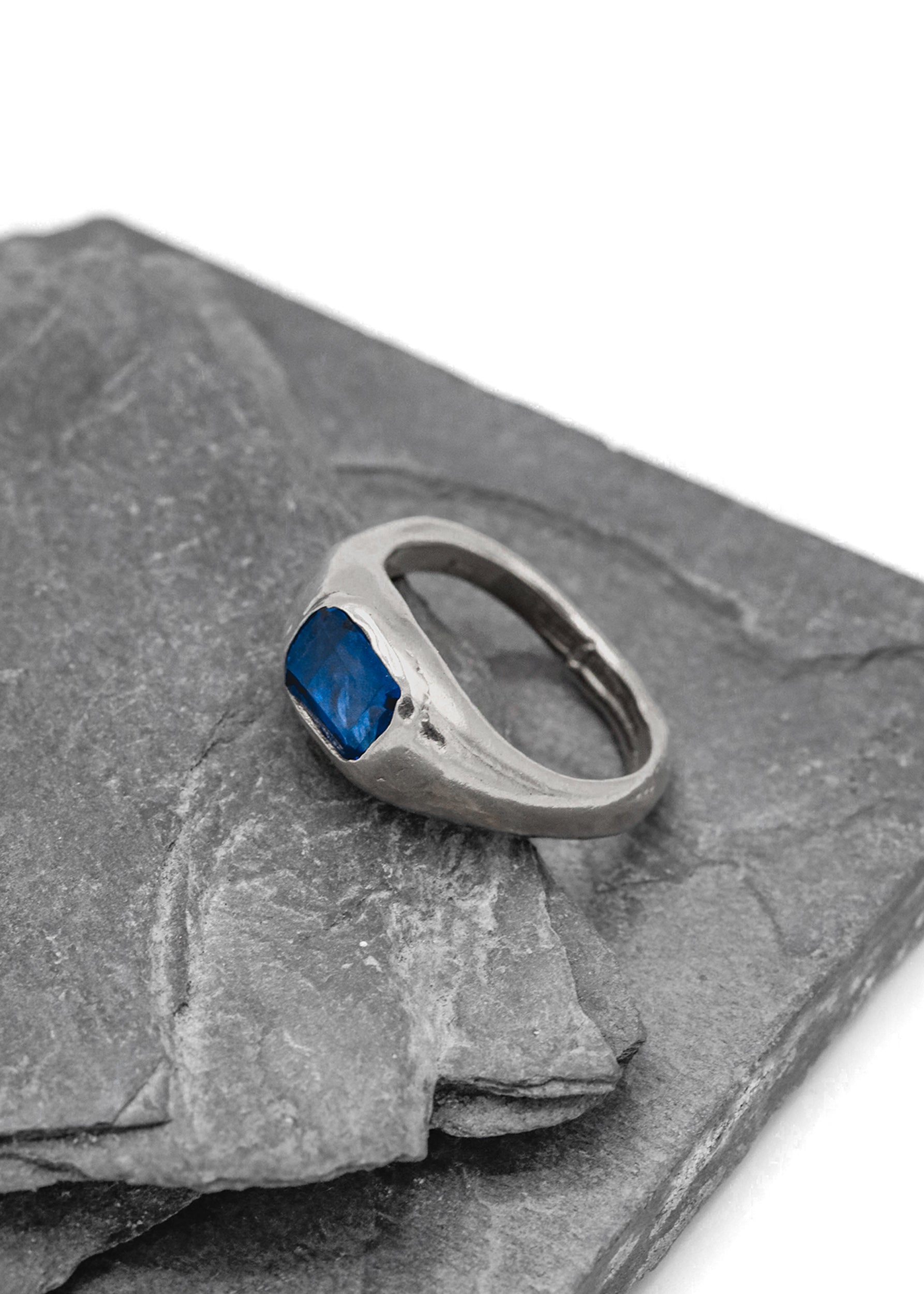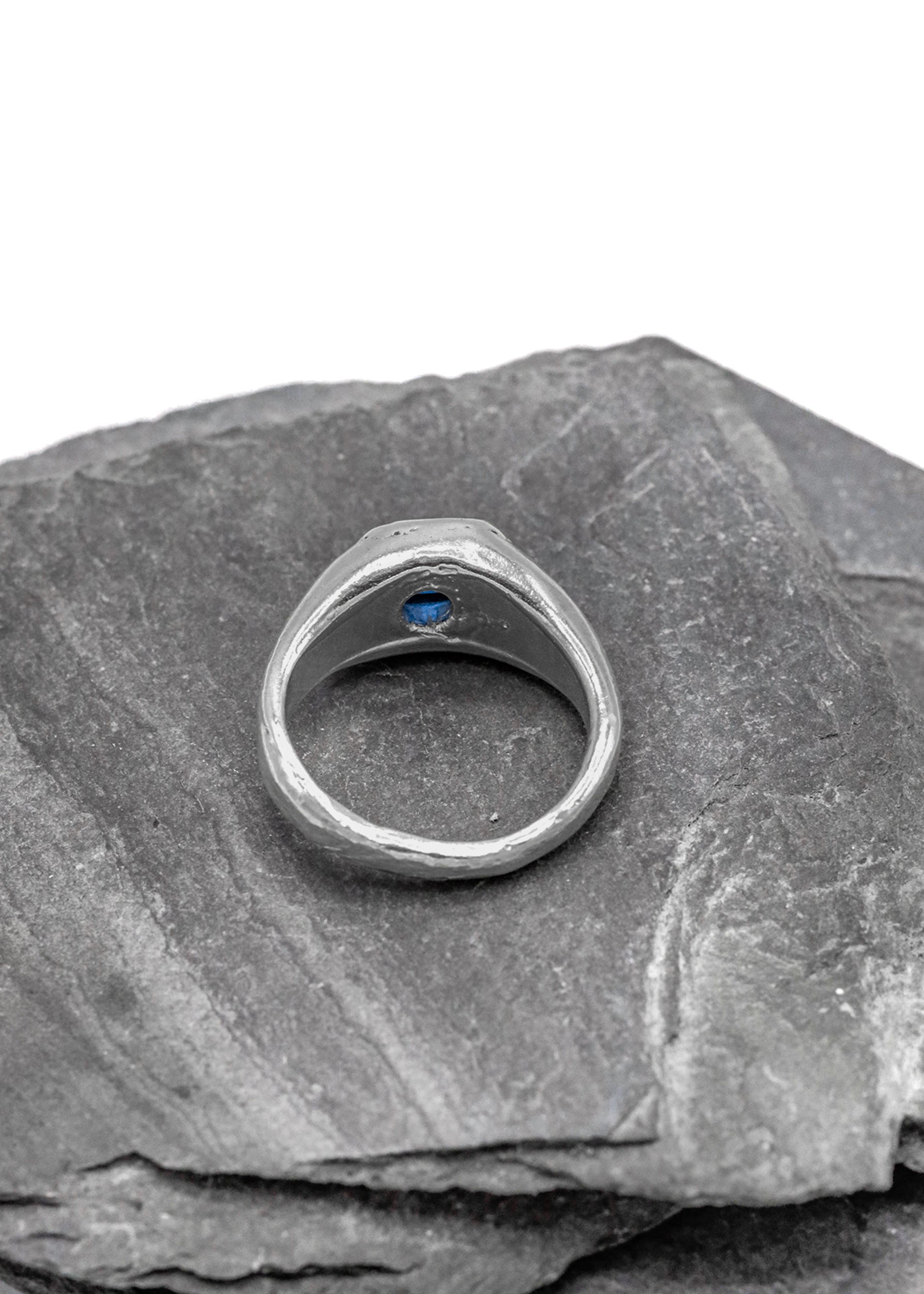 Sterling silver ring, set with a dark blue lab grown spinel