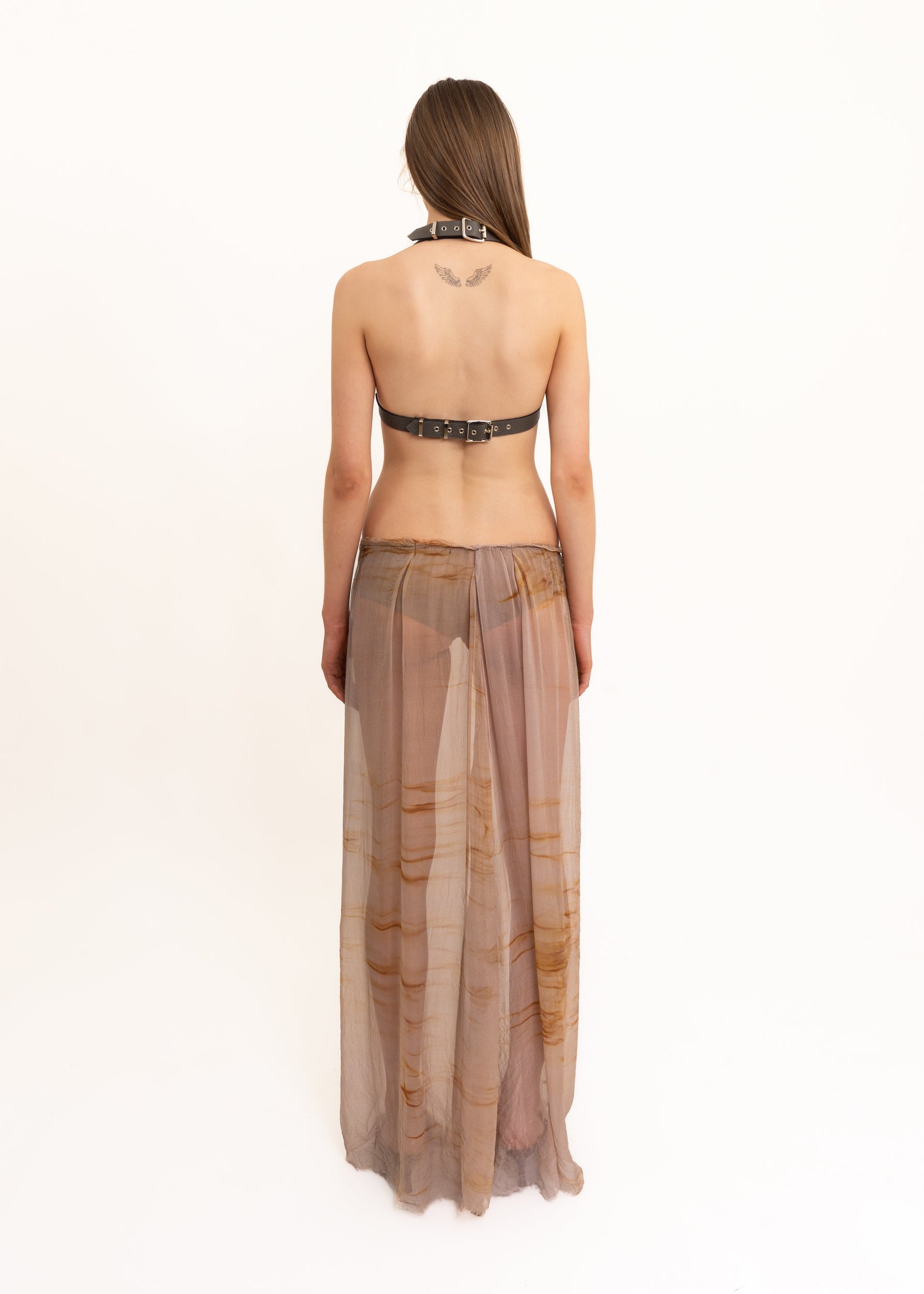 Snakeskin print leather bra/ bikini top with grey leather trims and cross detailing