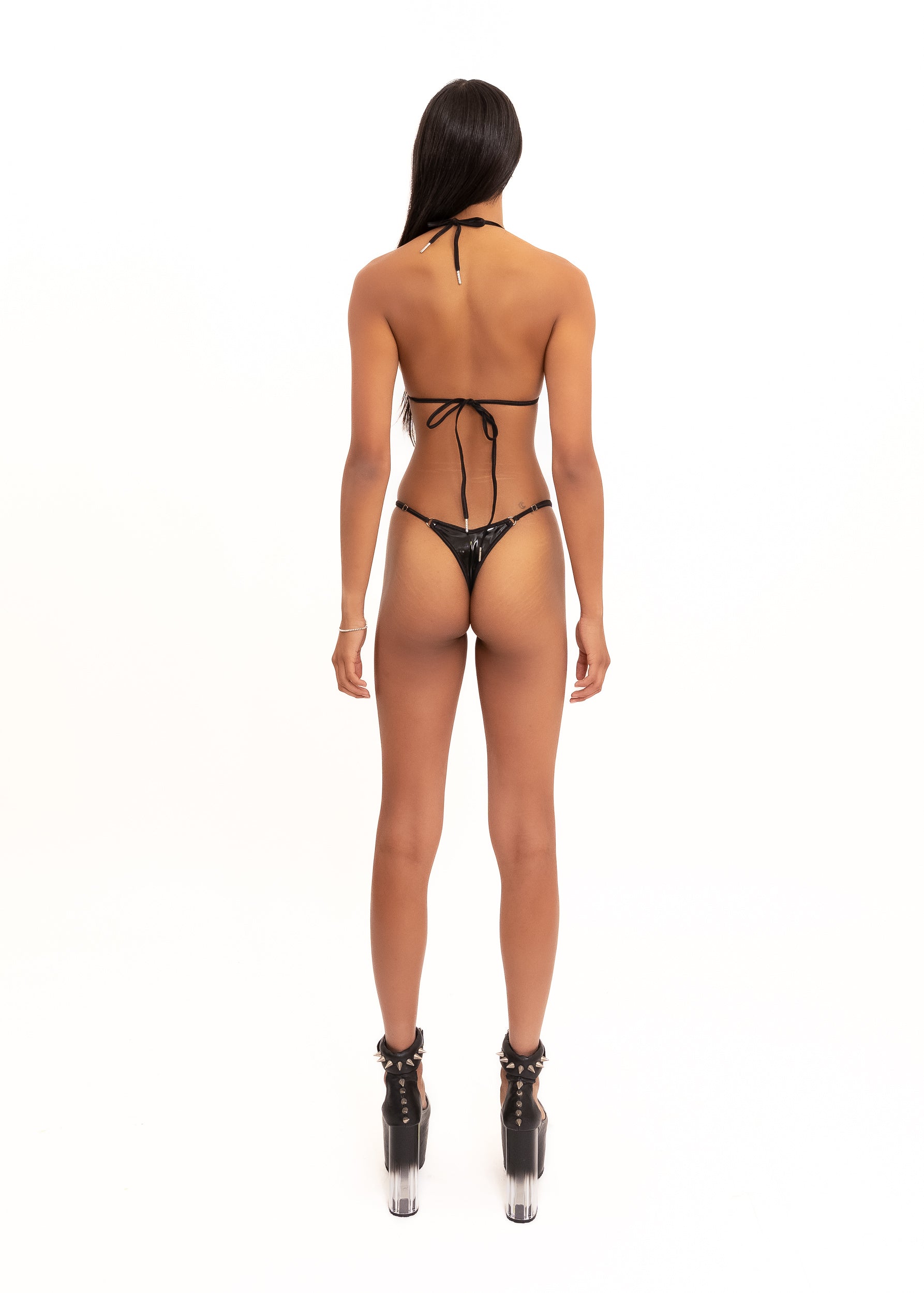 Micro triangle bikini top and matching cheeky thong bikini bottoms, in a black high shine PVC