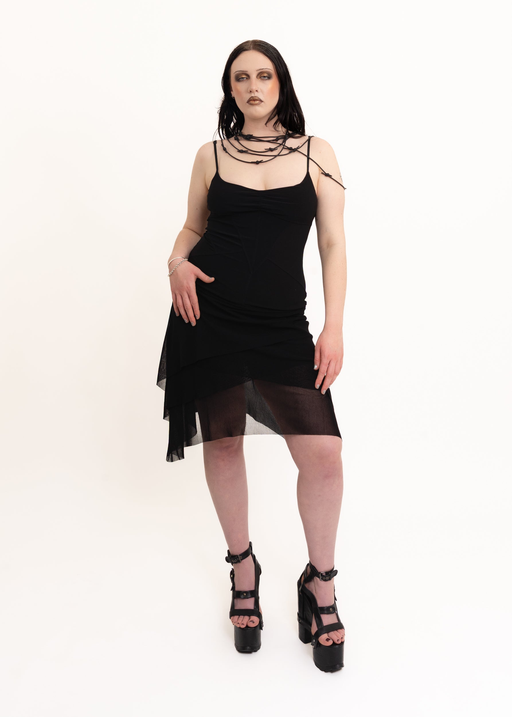 2000s vintage spaghetti strap mini dress with ruched bust, panelled bodice and mesh layered handkerchief hem skirt