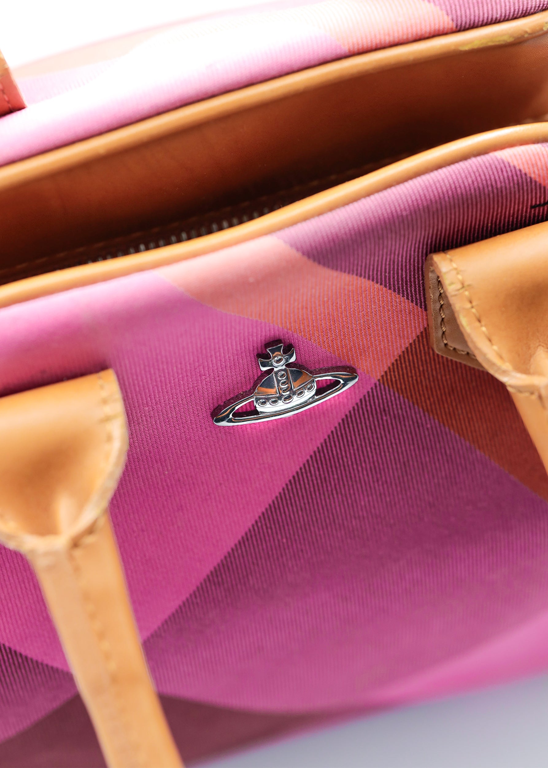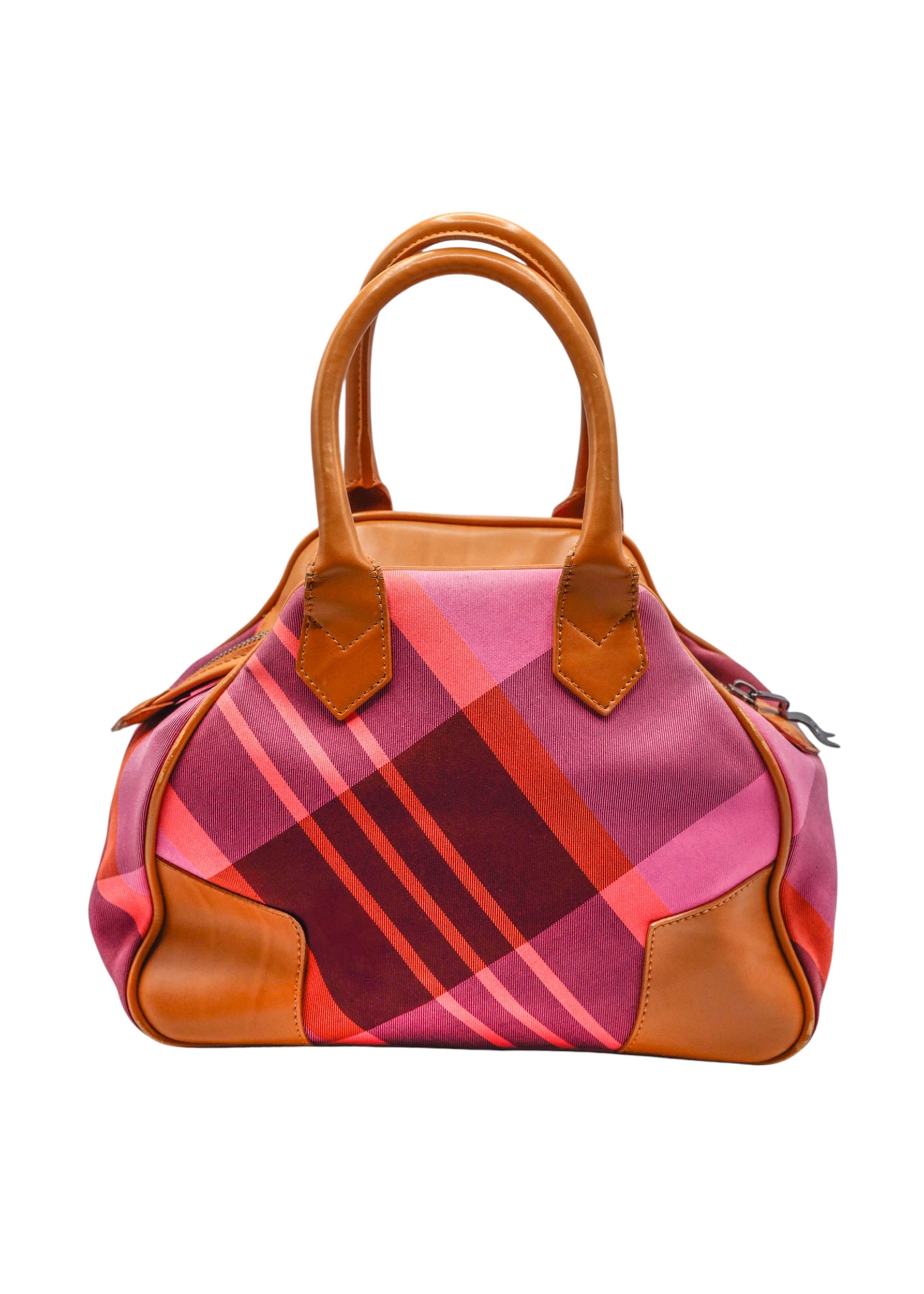 Vivienne Westwood pink and orange tartan Yasmine small bowler bag, with fabric body, tan leather handles, base and accents and gunmetal orb logo detail