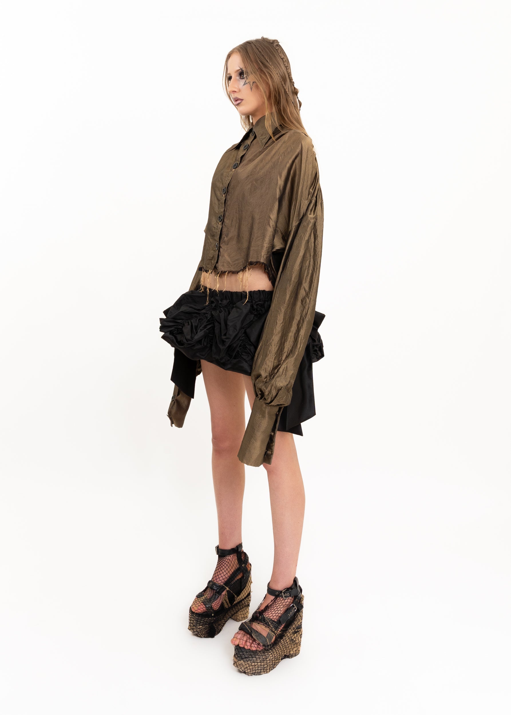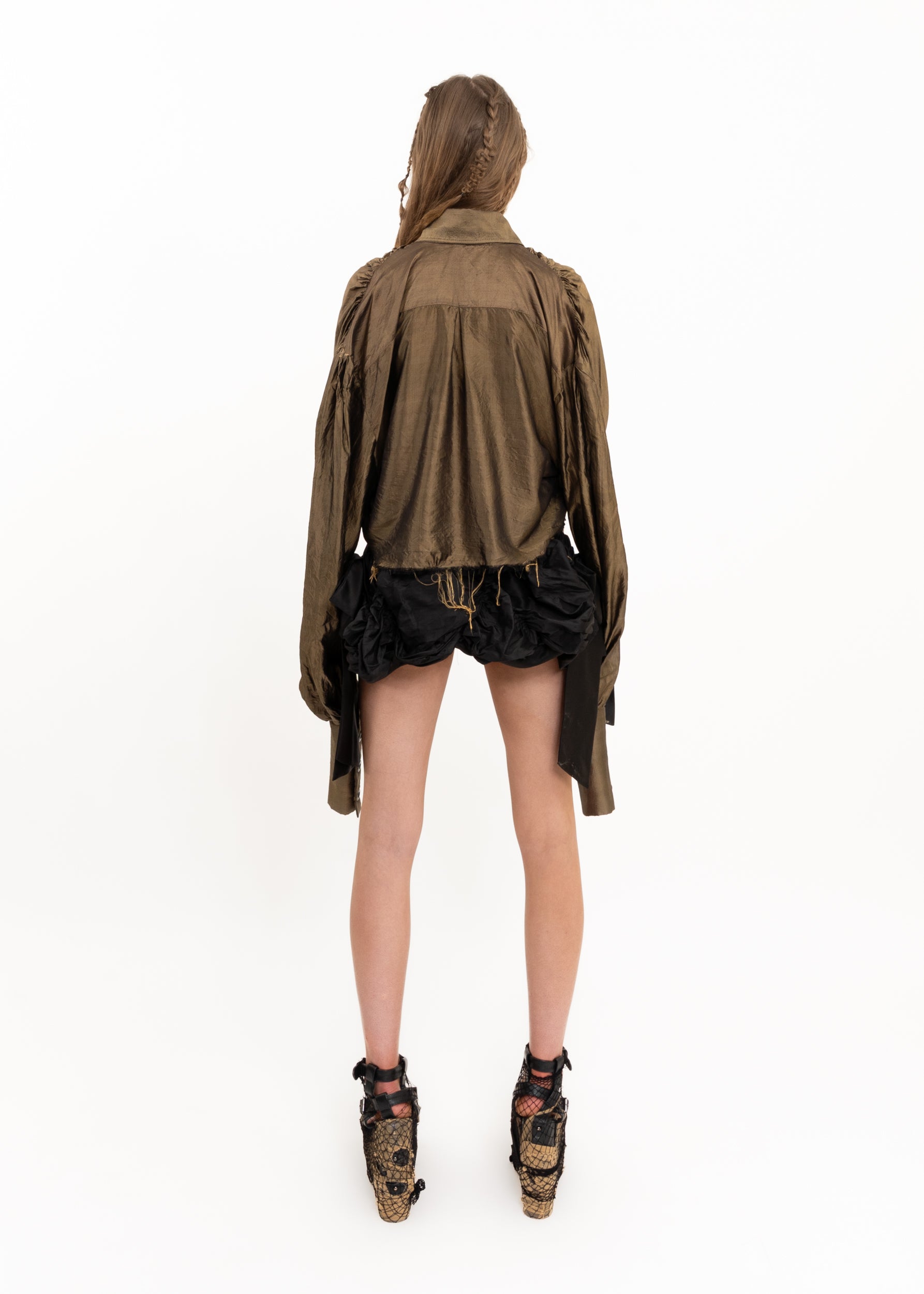One of a kind Jess Grindell button front silk shirt with oversized puff sleeves and raw hem