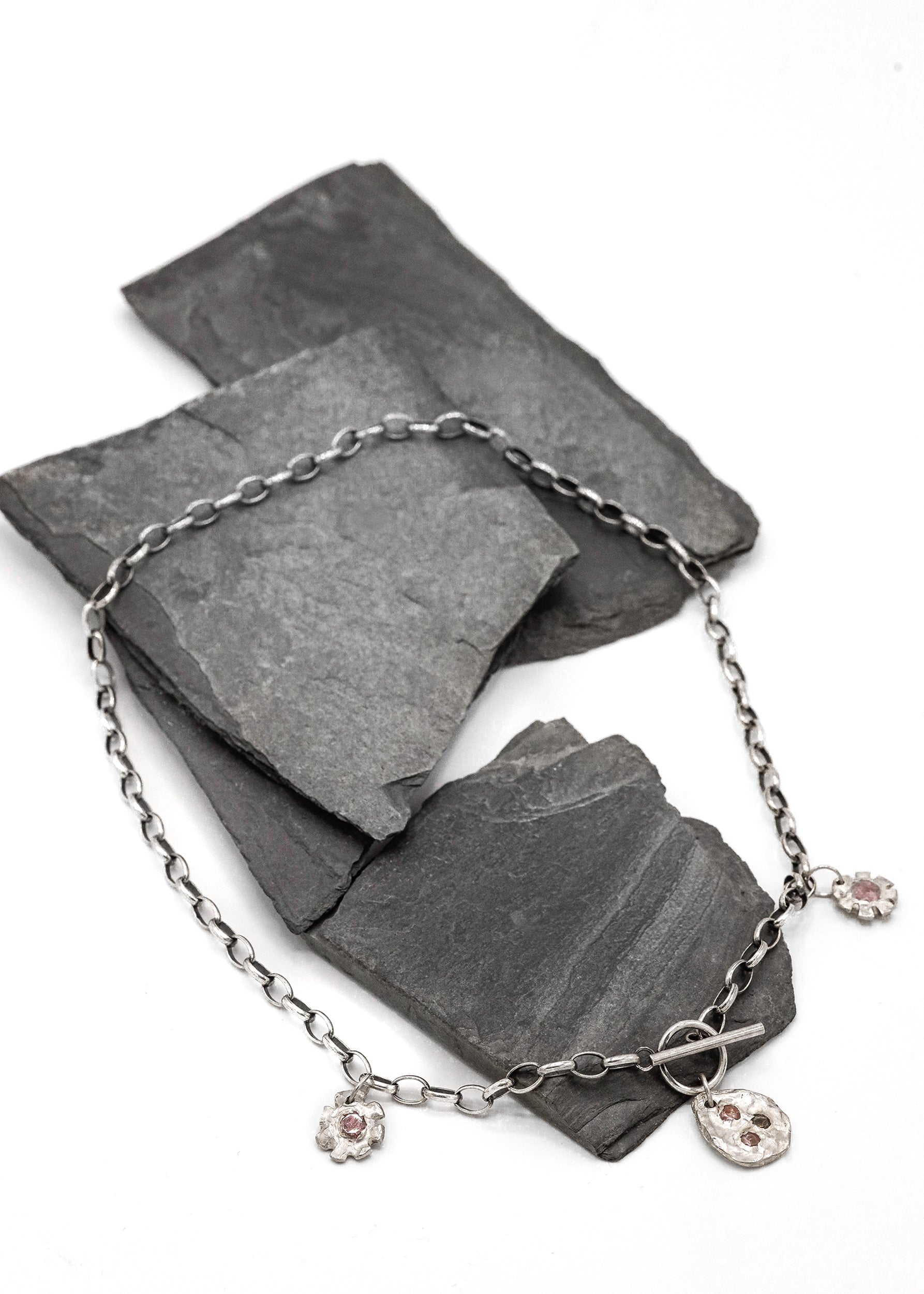A sterling silver lock chain, featuring three sterling silver charms, set with pink and green natural sapphires
