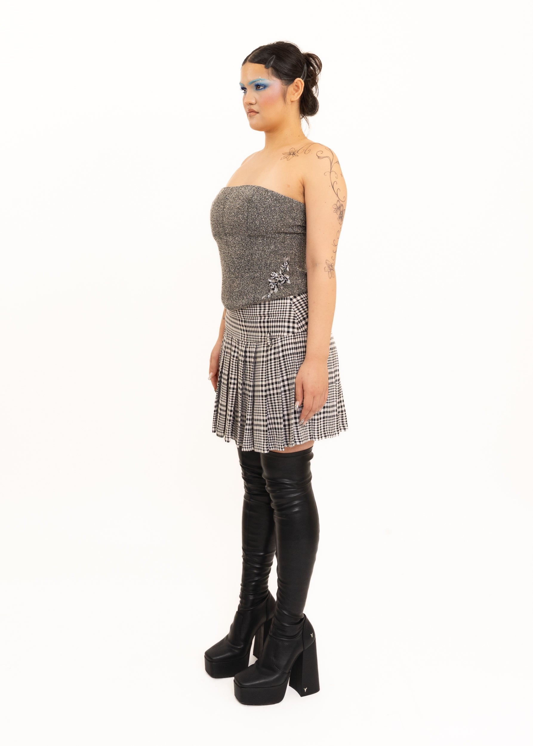 Styled with the drop waist tartan pleated skirt